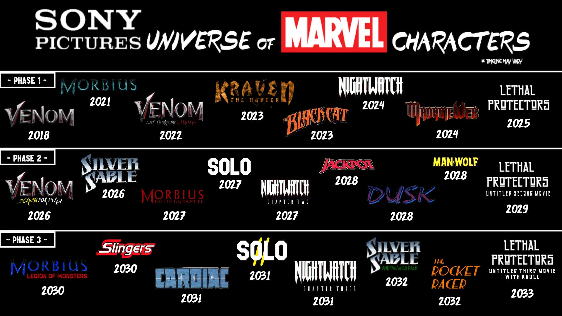 위 사진은 레딧에 한 팬이 제작한 소니 마블 유니버스 시리즈의 개략도이다. 대부분 개봉 예정 리스트이기 때문에 작품 명이나 연도 등이 바뀔 가능성이 많다. 위 리스트대로 순서를 정리해보자면,