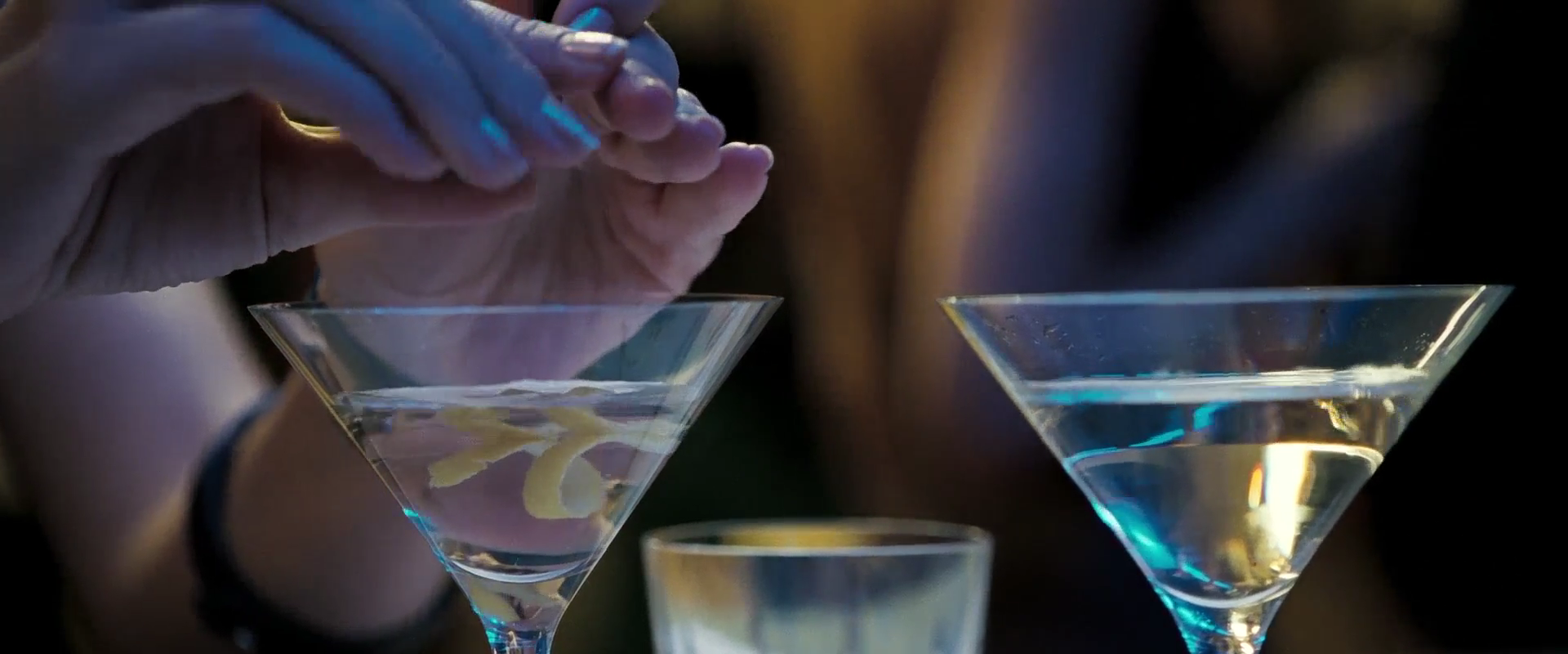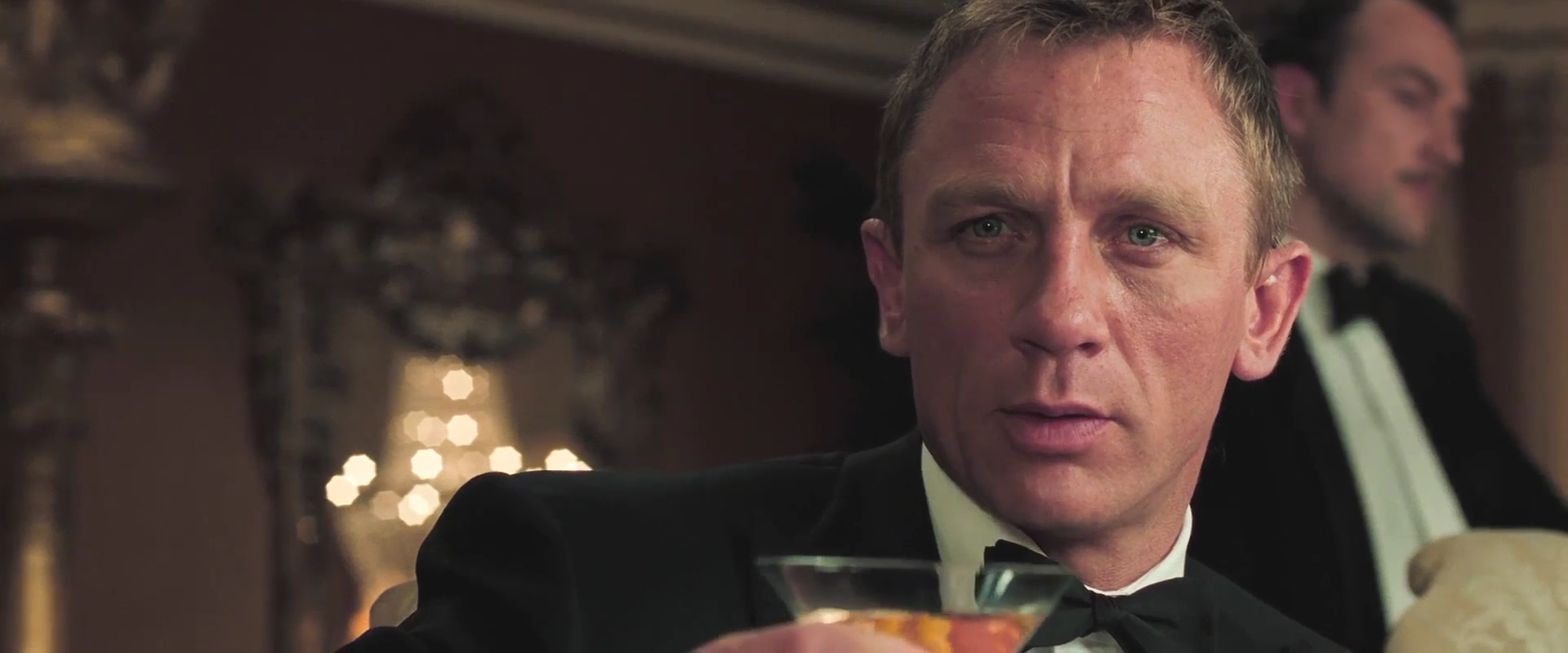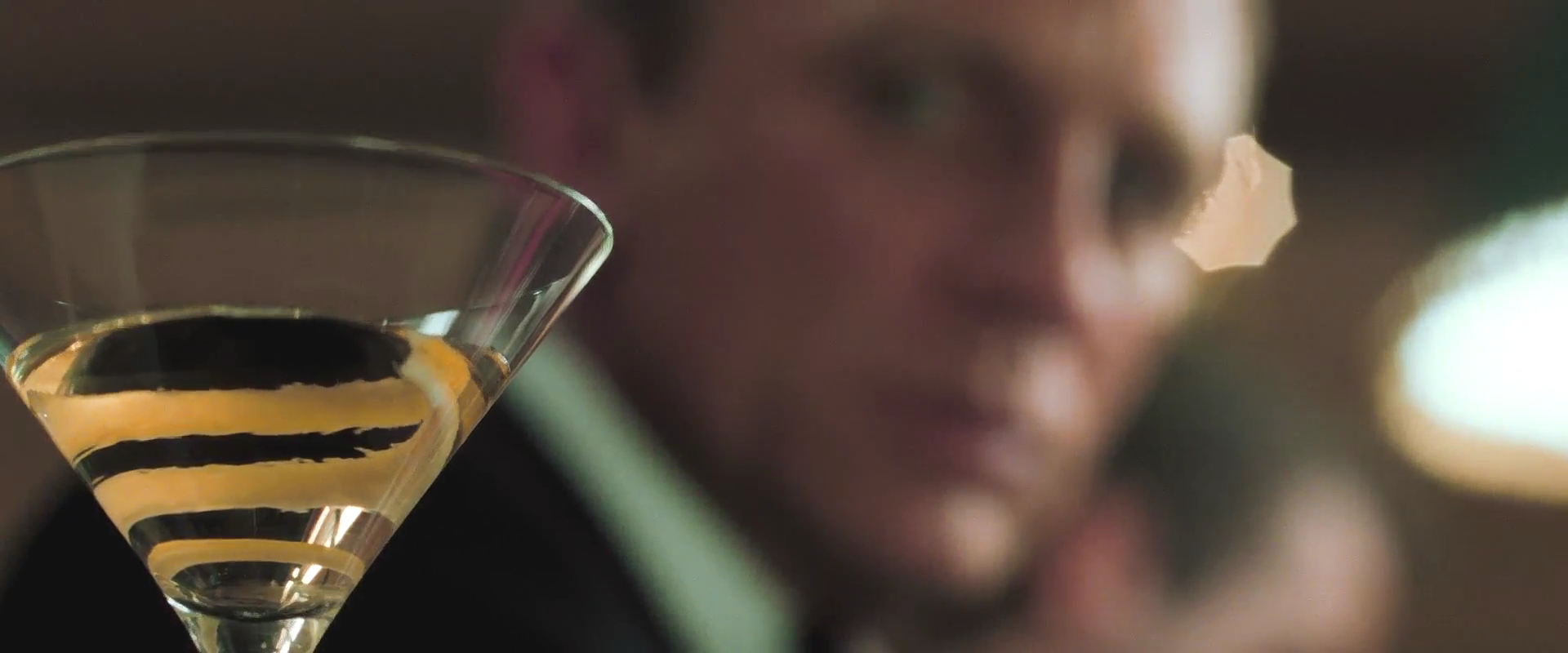 인상적인 연출은 독이 든 잔이다. 이 장면을 보고 나는 뱀을 떠올렸다. 얇게 썬 레몬 껍질이 유리와 술에 왜곡되어 뱀이 꽈리를 튼 듯 나선형 모양을 하고 있다. 나선형 모양은 일반적으로 어지러움을 상징한다. 그가 독이 든 술을 마시고 어지러움을 호소하는 것과 대응된다. 여기에 더해 술 이름이 "베스퍼"인 만큼 술의 주인인 베스퍼 린드도 떠오르게 만든다. 그녀는 본드를 배신했다. 성경에서 최초의 인간인 아담과 이브는 서로 짝을 이뤘다. 신은 아담과 이브에게 선악과를 제외한 것들만 먹으라고 경고하는데, 이브는 뱀의 간교에 빠져 결국 선악과를 먹게 된다. <카지노 로얄>에서 베스퍼는 제임스와 사랑에 빠지지만 후반부에 상금을 들고 도망치게 된다. 하지만, 이는 제임스의 목숨을 살려주는 댓가로 미스터 화이트에게 헌납하기로 한 돈. 결국, 뱀의 간교에 빠져 개인적 욕망인 사과를 먹기 위해(알제리 연인을 구하기 위해) 신(영국)을 배신한 이브(베스퍼)지만, 사랑하는 아담(제임스)에게도 호의로 사과를 건네준다. 개인적인 욕망에서 시작된 것이었지만, 아담을 위한 사랑도 있었다는 것. 따라서 베스퍼의 배신과 술의 독약, 나선형 모양이 이어져 꽤나 뜻 깊은 연출이었다. (술 "베스퍼"가 제임스 본드를 배신하지만, 연인 베스퍼가 그를 구한다.)