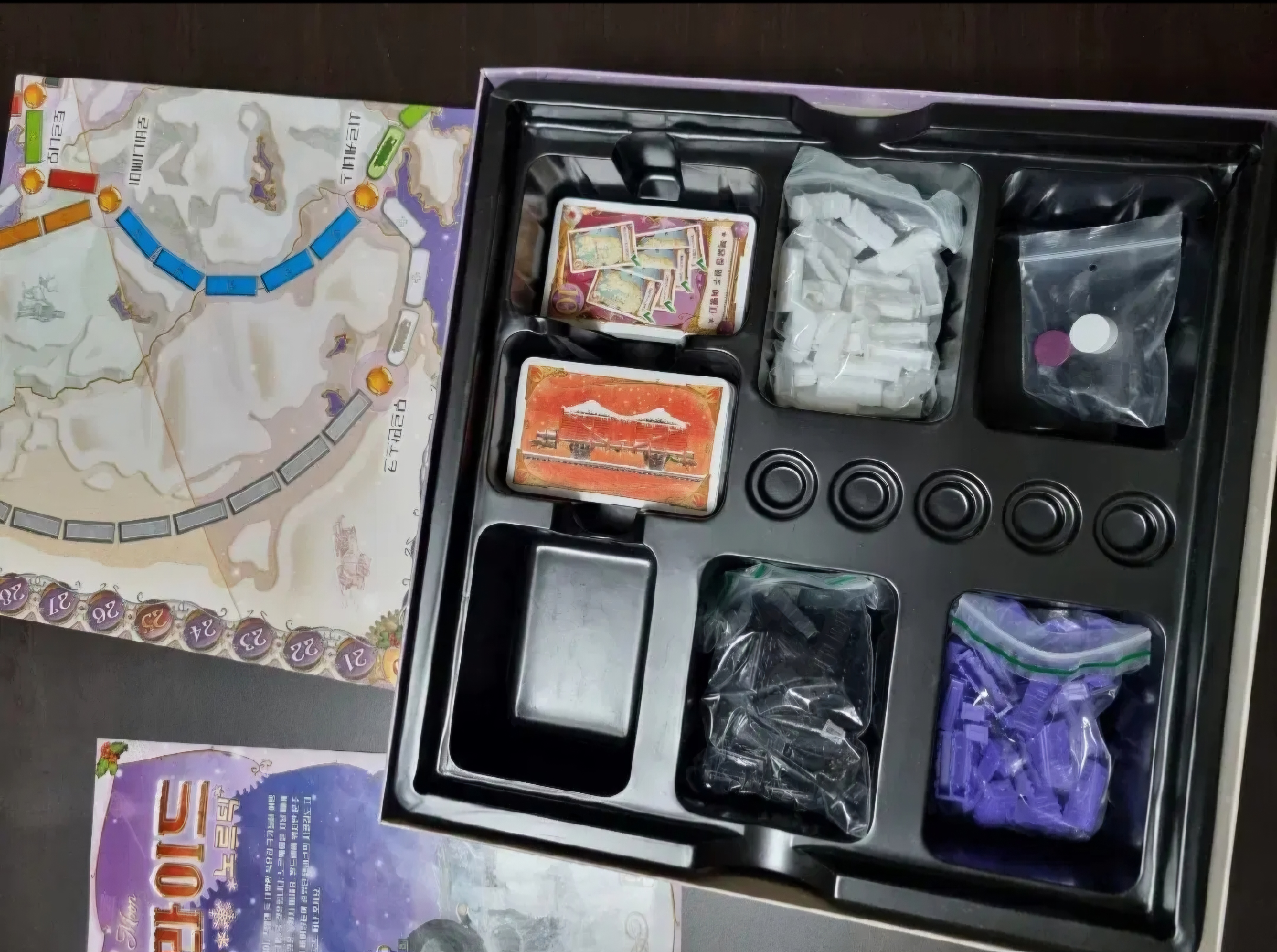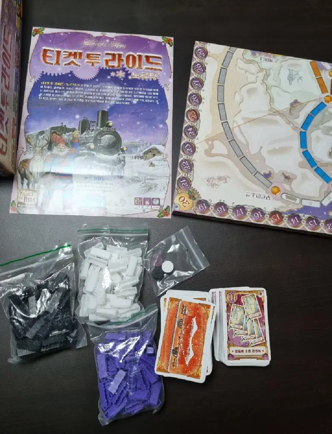 게임판 1개, 규칙서 1부, 점수 마커 3개, 기차 카드 157장(8가지 색 12장, 기관차 14장), 기차 120개(3개 40개, 여유분이 있음)입니다. 티투라는 스테디셀러인 만큼 시리즈가 참 많습니다. 기본 티투라, 티투라 유럽, 티투라 노르딕, 티투라 한국&이베리아, 티투라 뉴욕, 티투라 유령 열차가 정발됐습니다. 시리즈 별 주된 차이는 맵 지역이 다릅니다. 노르딕은 스칸디나비아 반도와 그 주변을 배경으로 하고 있죠. 눈을 내리는 게 포인트라 다른 시리즈에 비해 크리스마스 분위기가 나서 게임판과 카드가 아름답습니다. 노르딕은 2-3인 전용으로 나와 게임판 맵이 유럽과 동사이즈 52.4x78.8cm이지만 노선 수가 줄어들었습니다. 기차 색깔도 흰색, 보라색, 검은색 3가지인 게 특징입니다.