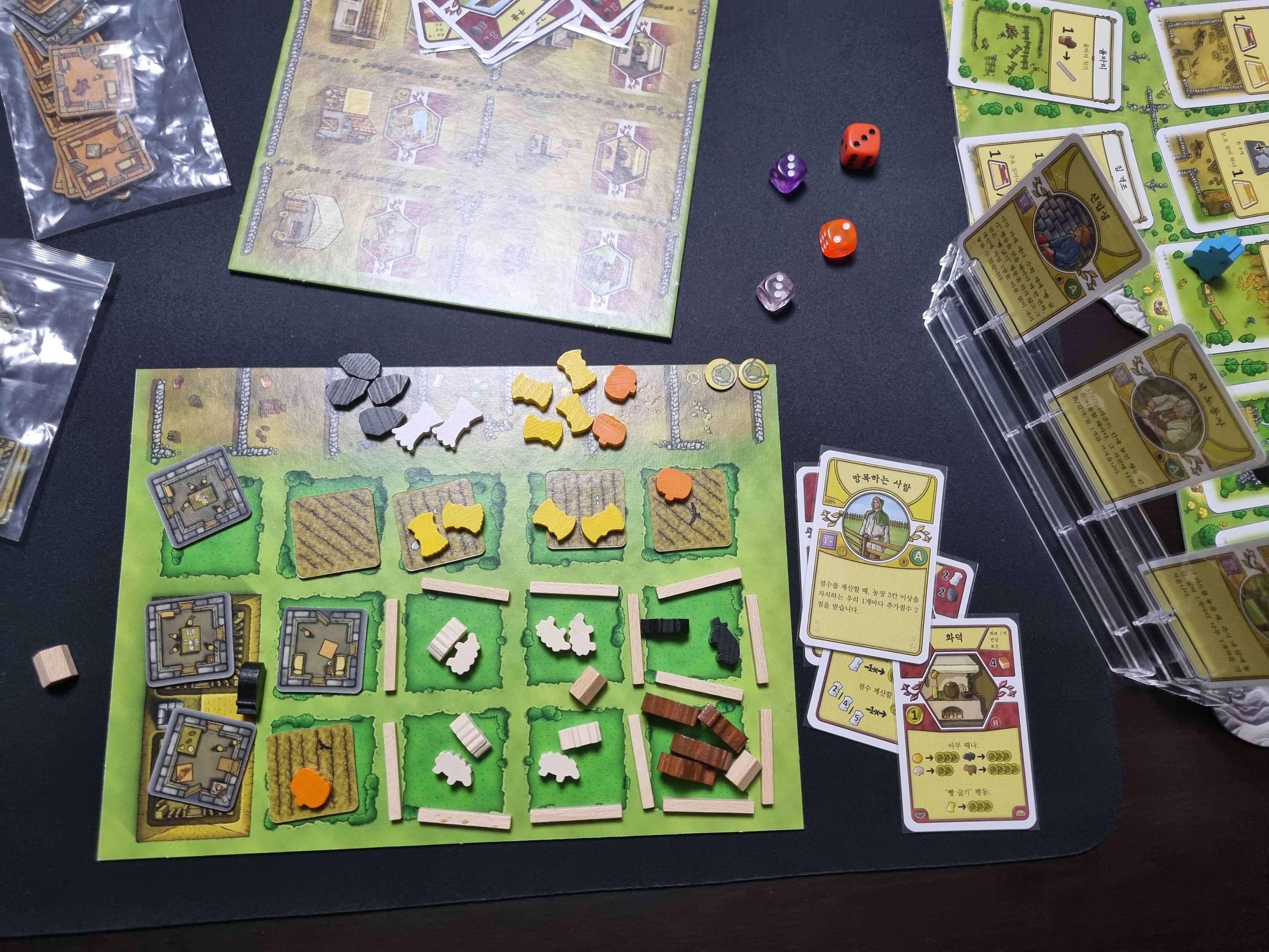 그럼에도 평점을 낮게 준 건 본판만으론 카드 수량이 너무 적어 리플레이성이 낮은 점 때문입니다. 아그리콜라의 핵심은 다양한 카드 조합입니다. 아그리콜라를 계속 즐길거라면 확장 덱은 선택이 아닌 필수입니다. 카드 텍스트 압박이 있기 때문에 경험치가 적을수록 하고 나면 살짝 진빠지는 느낌이 있습니다. 특히 라운드가 끝날 때마다 자원 누적 칸을 채우는 게 에너지 소모가 컸으나 주사위를 사용하면서 스트레스가 상당히 해소됐습니다. 게다가 종료 시점이 14라운드로 정해져 있어서 테포마보단 덜 지쳤습니다. 밥 먹이기 특유의 빡빡함 때문에 호불호를 많이 타지만 저에겐 카드 조합으로 어떻게 생존할 것인지 강구해내는 재미가 훌륭합니다.
