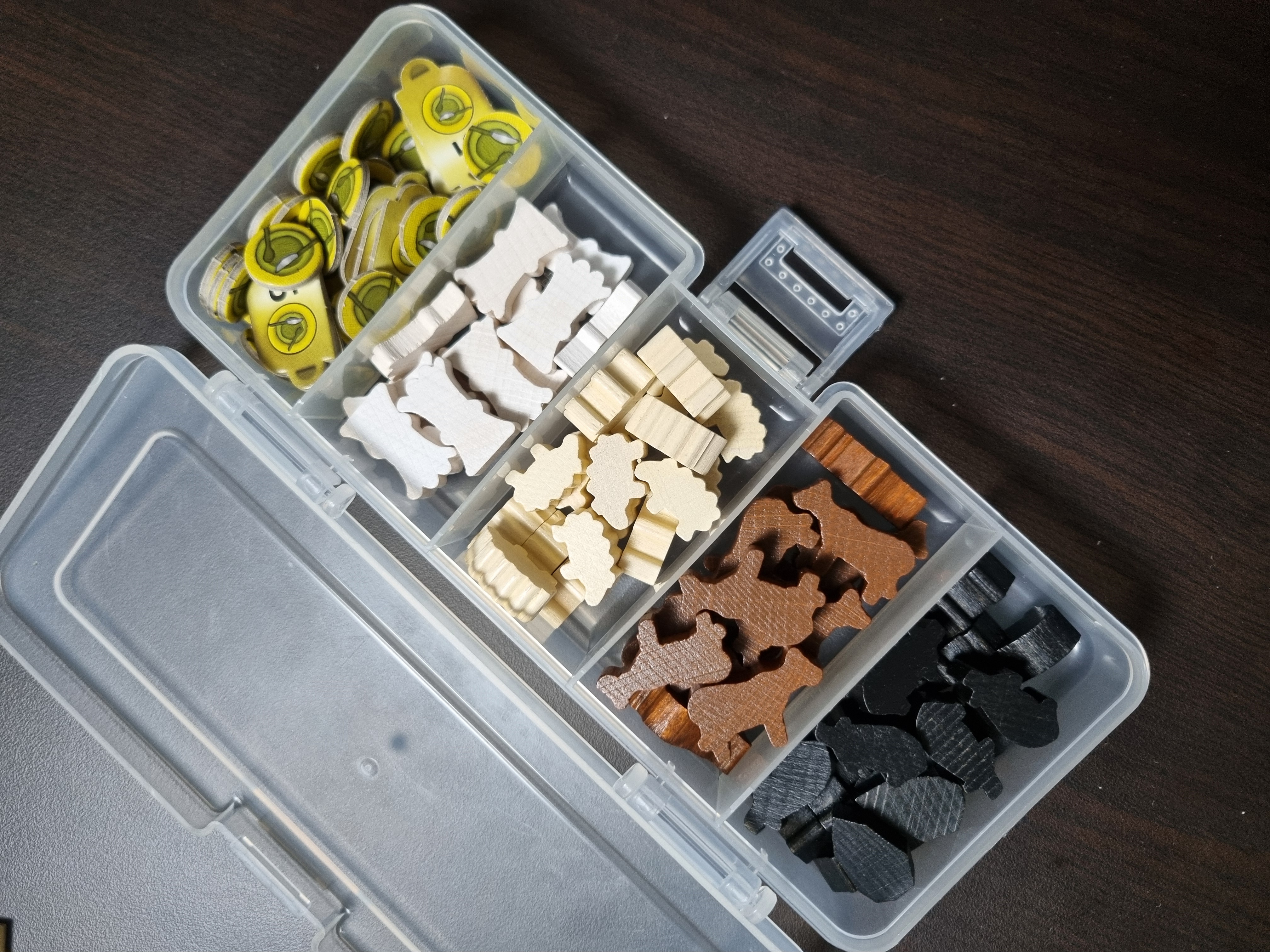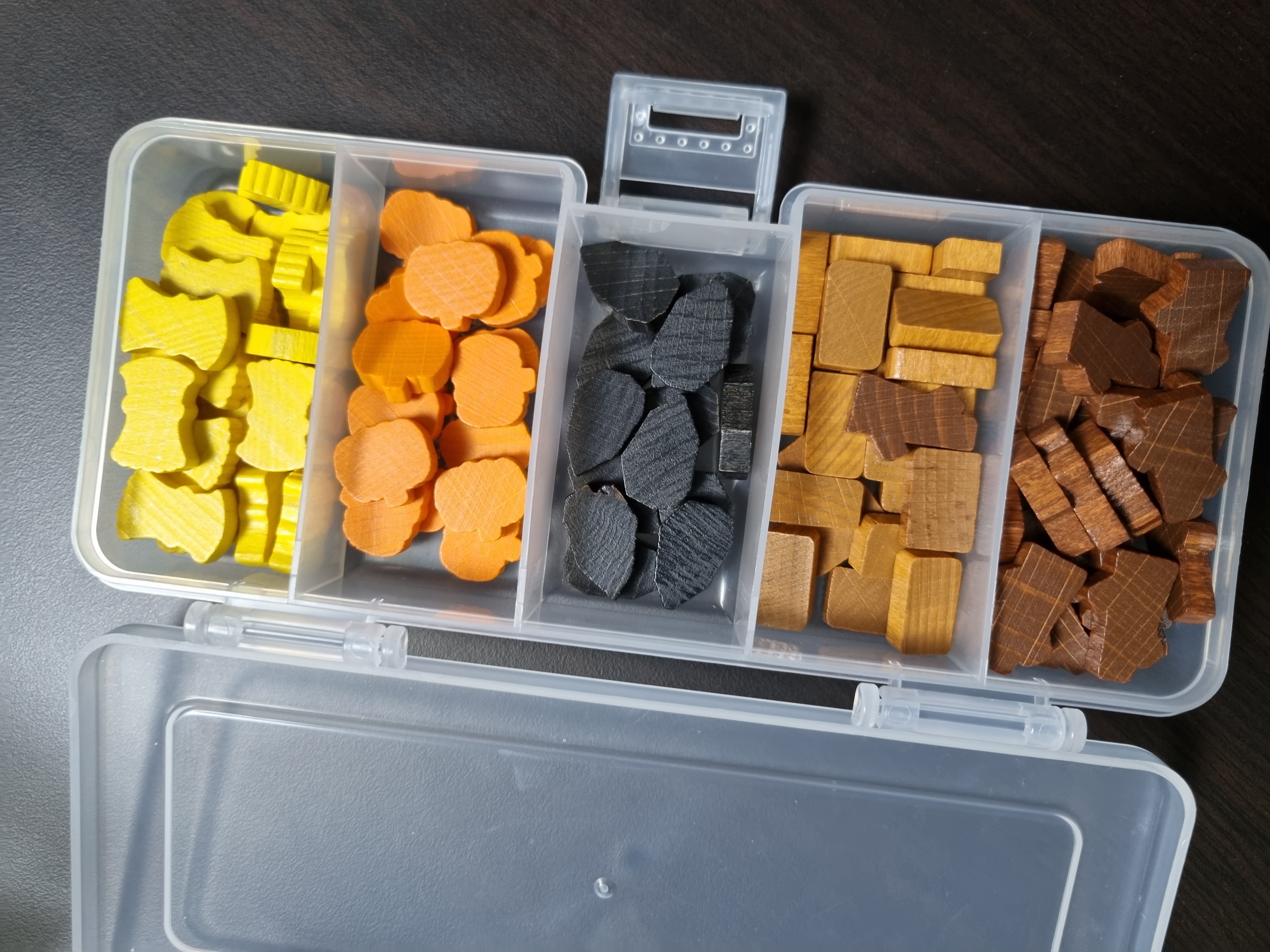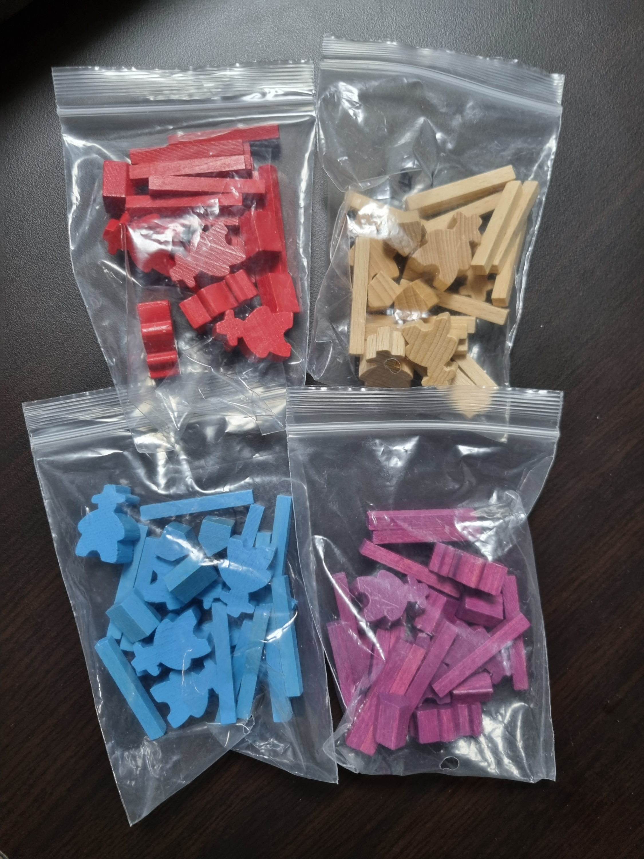 양 18마리, 멧돼지 15마리, 소 13마리, 나무 30개, 흙 24개, 갈대 14개, 돌 16개, 곡식 24개, 채소 16개, 시작 플레이어 말 1개, 울타리 색깔 별로 15개씩 총 60개, 외양간 색깔 별로 4개씩 총 16개, 가족 구성원 5명씩 총 20개. 색깔은 오트밀, 보라색, 빨강, 파랑색이 있습니다.