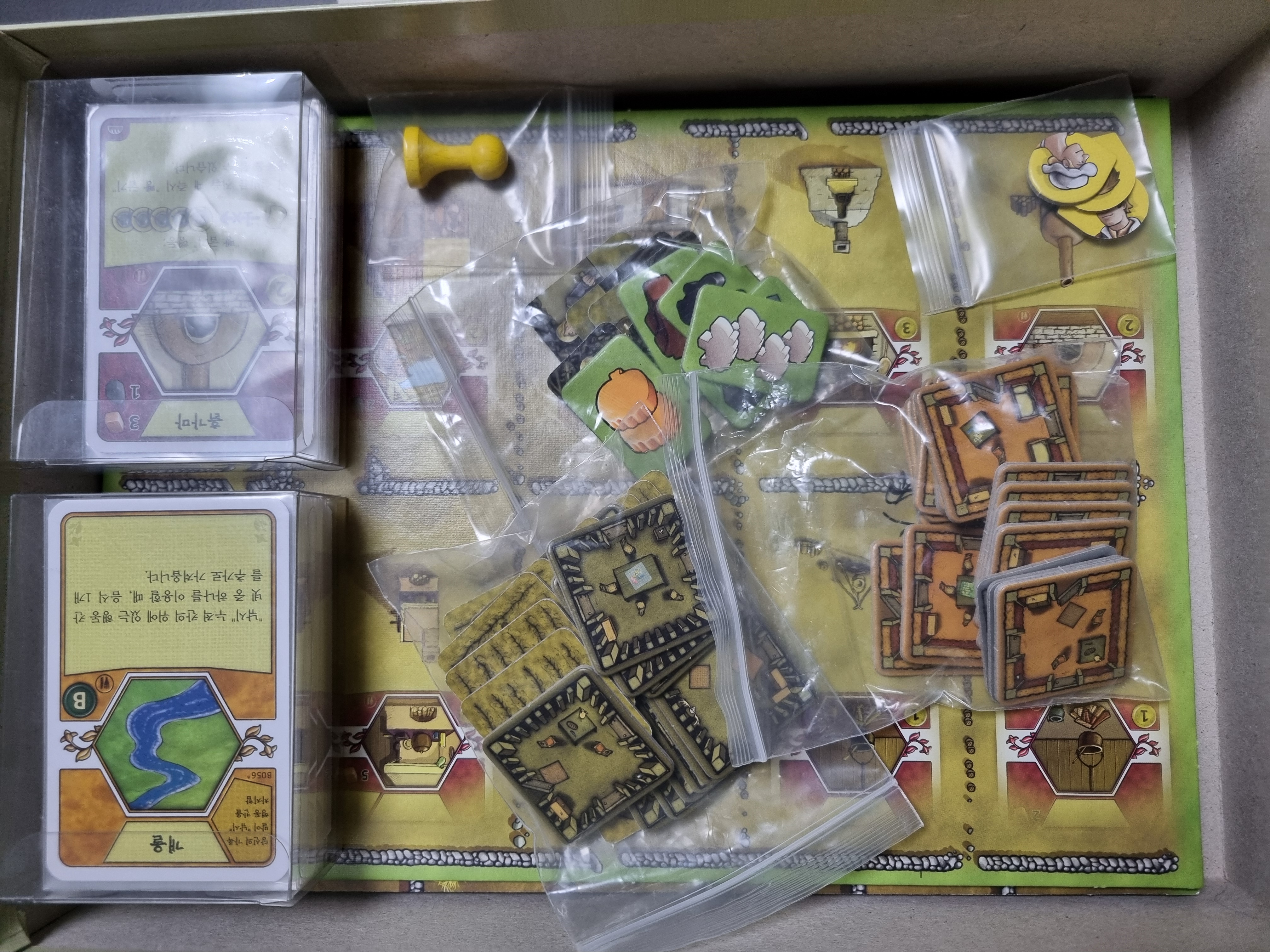 아그리콜라 구판과 개정판 간의 구성품 차이가 큽니다. 전체적으로 일러스트가 개선되었습니다. 르아브르 컴플리트 에디션처럼 3장으로 분리되었던 게임진행판이 접어서 보관 가능한 하나의 판으로 바뀌었고, 인원수 별로 카드를 놓아 행동 칸을 추가했던 게 조립형 보조판으로 나왔습니다. 훨씬 더 깔끔해졌습니다. 인원에 따라 선택 규칙 타일도 추가할 수 있어 행동 칸을 늘려 빡빡함을 줄여 줍니다.