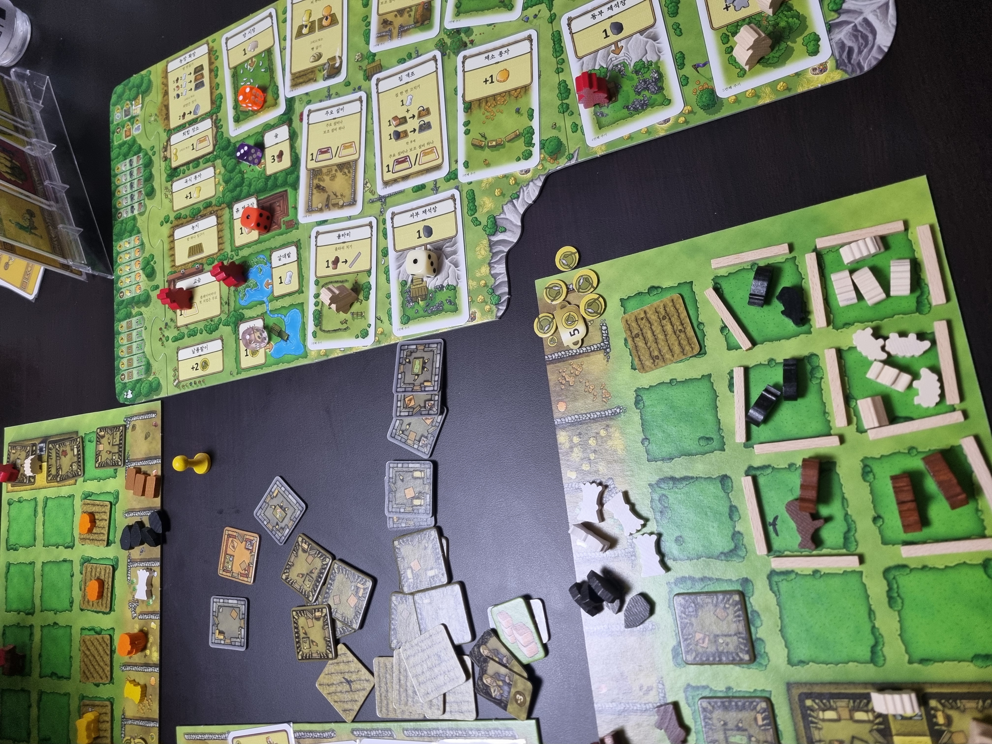 자리 싸움이 치열합니다. 게임을 하다보면 "내가 거기 가려고 했는데...!"라는 표현이 자주 나옵니다. 특히 초반엔 교습, 초중반엔 나무 경쟁이, 5-7라운드엔 가족 늘리기 칸 경쟁이, 후반부엔 급한 가족 늘리기 경쟁이 치열합니다. 행동 칸 선점 싸움은 뭔가를 뺏는 행동은 아니기 때문에 기분이 상하진 않습니다만, 초보자와 숙련자가 함께 하는 경우 초보자가 압살당해 아그리콜라 자체에 학을 떼는 경우가 발생할 수 있습니다. 당연한 소리겠지만 여타 다른 전략 게임처럼 경험치가 없을수록 운영하기가 어렵습니다. 몇 라운드에 어떤 행동 카드가 오픈되고, 무엇을 대비해야하는 지가 꽤나 중요하기 때문입니다.