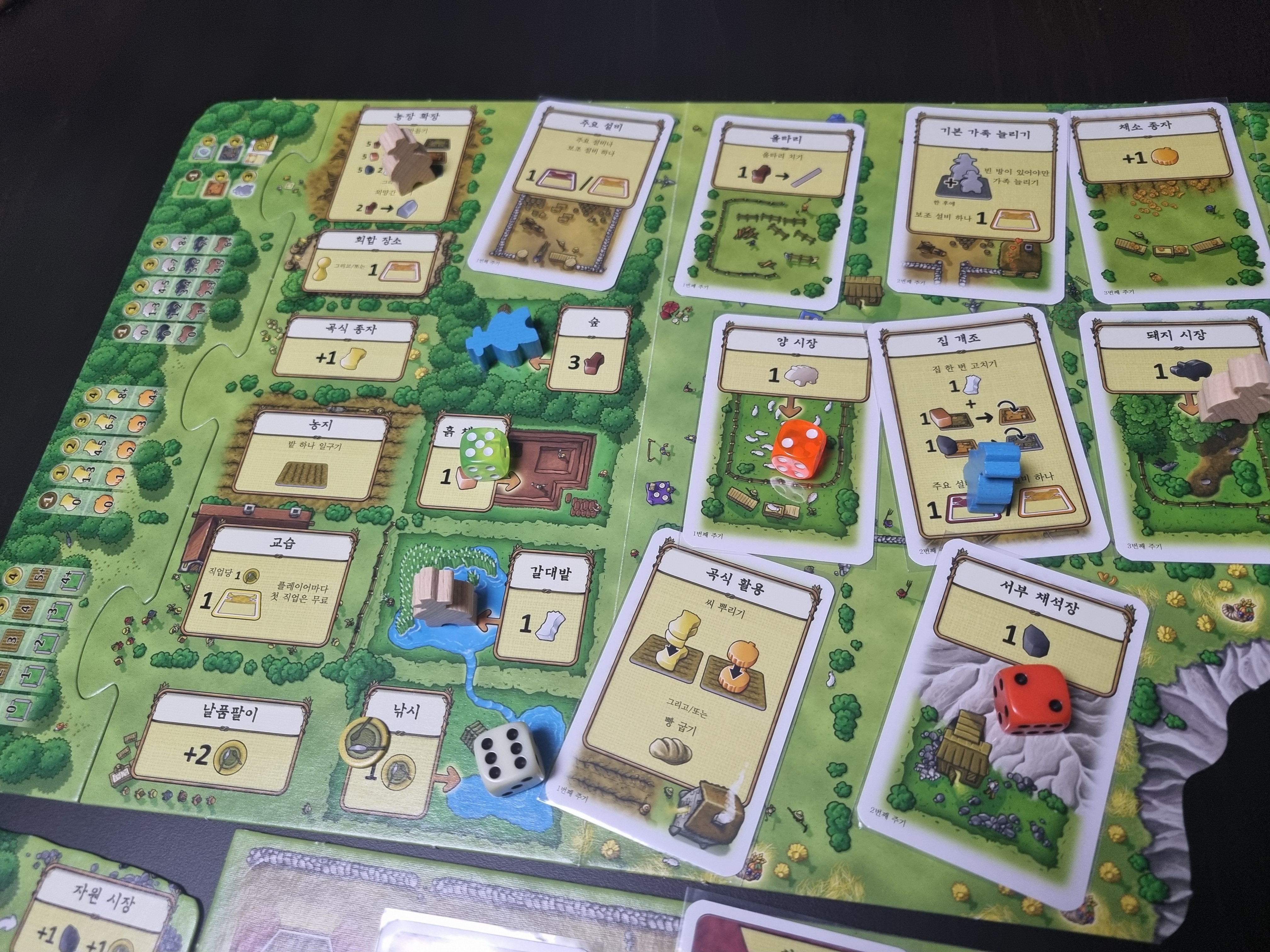 플레이어는 각자 두 명의 일꾼으로 시작합니다. 시작 플레이어부터 번갈아가며 한 번씩 일꾼 놓기를 진행하고, 이를 통해 들고 있던 카드를 사용하거나 자원을 얻거나 밭과 우리, 집을 지을 수 있습니다. 애도 낳아 5명까지 일꾼을 늘릴 수도 있죠. 흑사병이 사라진 직후인 1670년경 중부 유럽의 열악한 농부의 삶을 배경으로 하고 있기 때문에 수확 시즌마다 일꾼 머릿수만큼 지불해야하는 음식의 빡빡함으로 악명이 높습니다. 그래도 개인 농장판에서 불어나는 동물과 곡식, 사람들을 보는 재미가 있습니다.