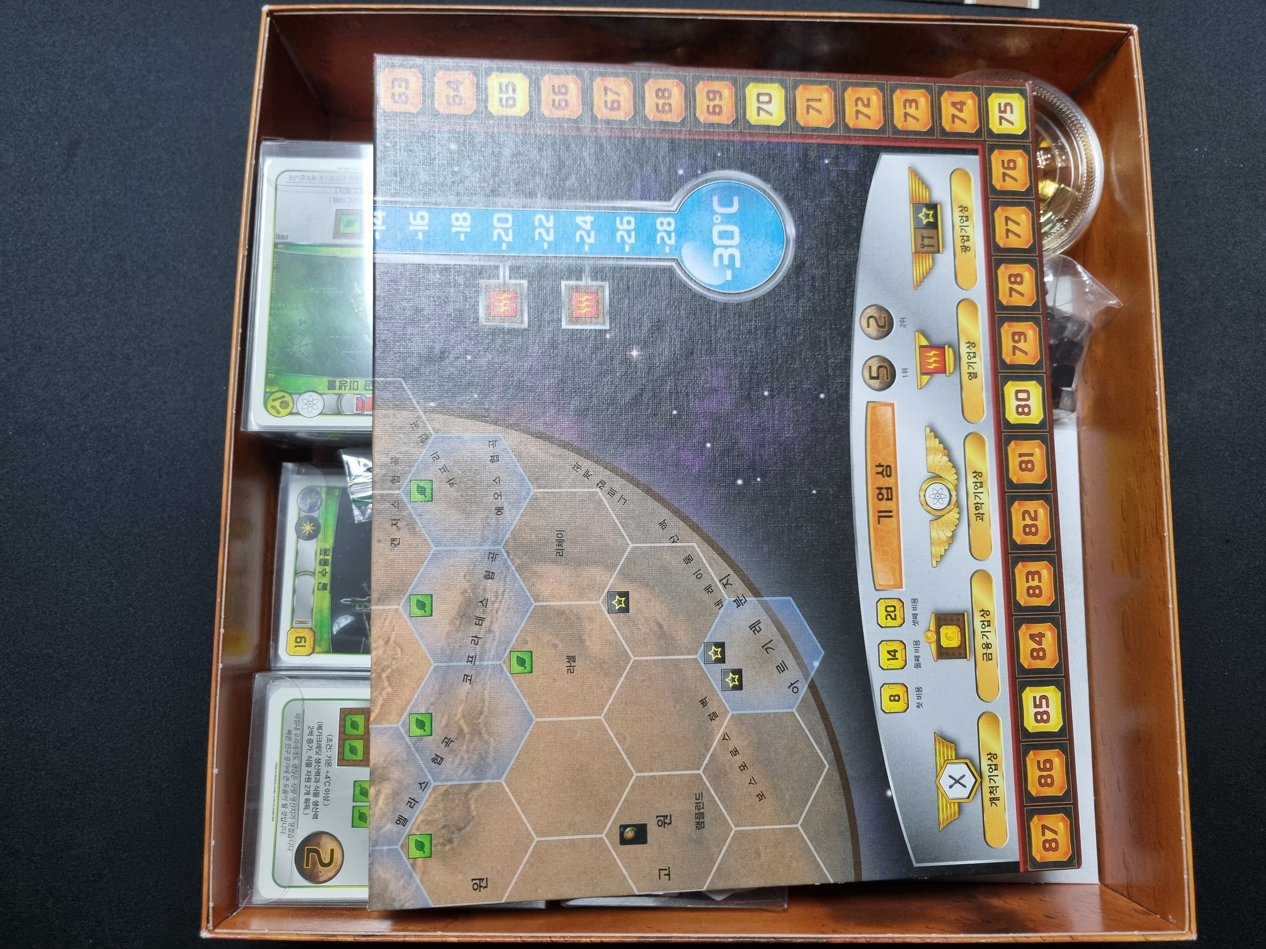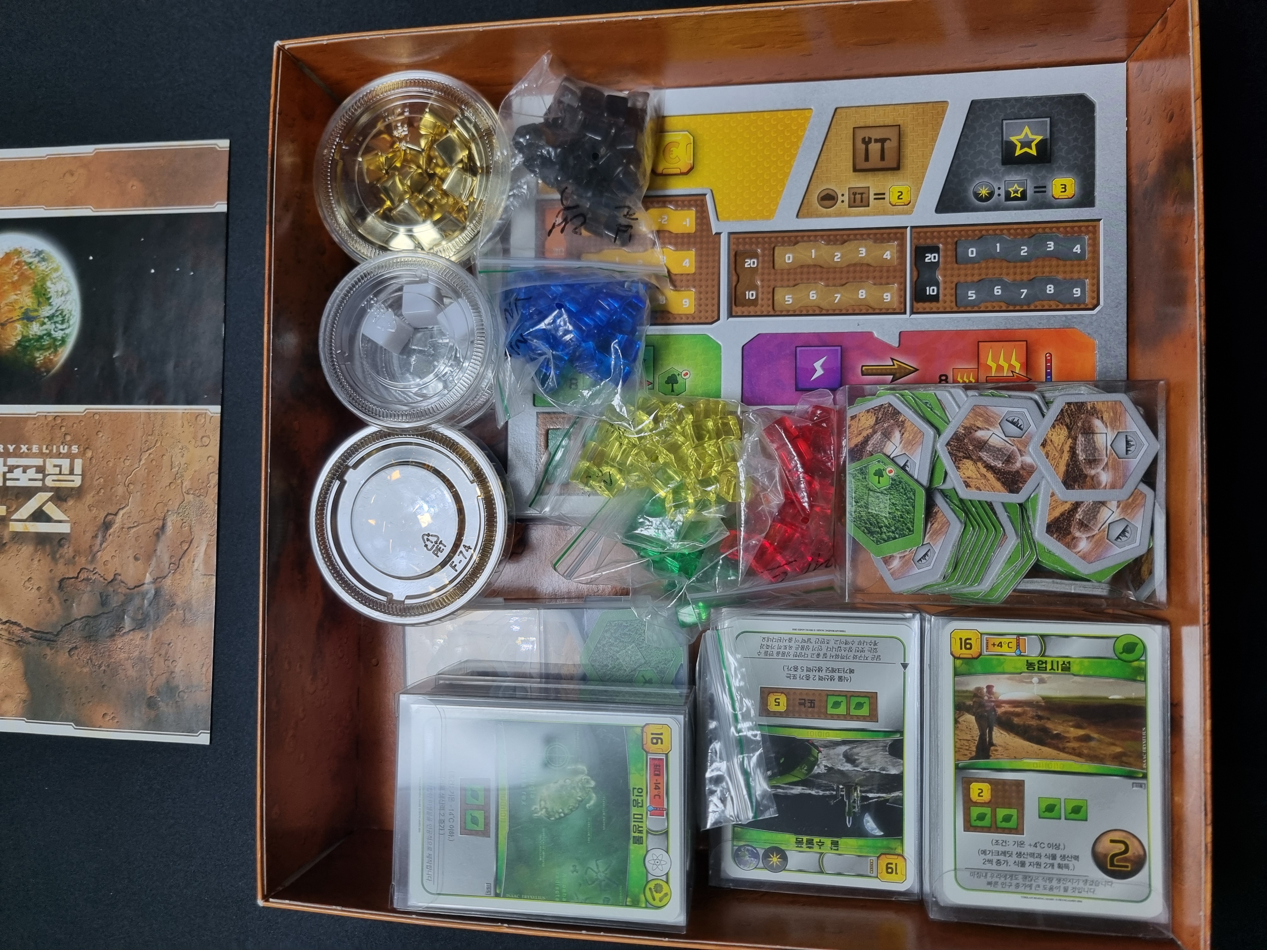 규칙서 1부, 중앙 게임판 1개, 개인 게임판 5개, 색깔 마커 약 200개(반투명 플라스틱 큐브, 5가지 색깔), 자원 큐브 약 200개(유광 큐브, 3가지 색깔), 카드 233장(기업 카드 17장, 프로젝트 카드 208장, 요약표 카드 8장), 타일 80장(해양 타일 9장, 녹지\도시 타일 60장, 특수 타일 11장), 흰색 마커 3개(큰 흰색 큐브, 기온, 산소 농도, 세대 표시용), 시작 플레이어 마커 1개.