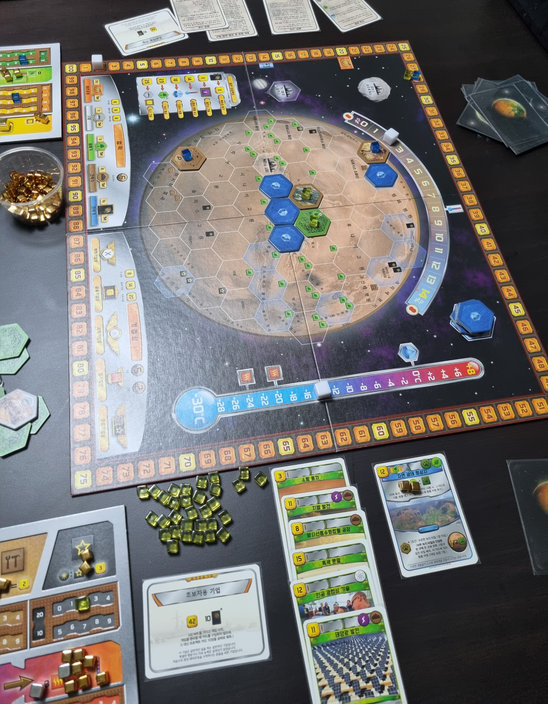 웨이트에 비하면 세팅이 간단합니다. 다만, 게임 중 읽어야 하는 카드량이 많은 게 부담입니다. 자기 차례가 되면 카드 4장을 뽑아 읽고 구매할지 말지 선택해야 합니다. 만약 게임 밸런스를 위해 카드 드래프팅을 시도하면 서로가 가진 카드 4장을 모두 읽어야 해서 부담이 좀 더 늘어납니다. 카드를 내려놓고 지속 효과 카드나 행동 효과 카드를 기억하고 있어야 하는 것도 진입장벽으로 통합니다. 카드 할인을 적용해야하는데 놓칠 수 있어 초보자가 제대로 운영하기엔 힘든 요소가 많습니다. 그래서 파란색 카드는 내려놓는 순서대로 분류해둘 게 아니라 지속 효과 카드, 행동 카드로 분류해놓고 습관적으로 체크하는 습관을 들여야 합니다. 그래도 고웨이트 게임과 비교하면 룰이 간단하고 직관적이라 고웨이트 게임을 입문하기 위한 게임으로는 적합합니다. 막상 해보면 산소, 온도, 해수면을 까는 목적이 명확해 게임이 어렵다는 느낌은 적습니다. 초플에 카드를 아무렇게나 내려놔도 뭐가 진행되는 느낌이 들긴합니다.