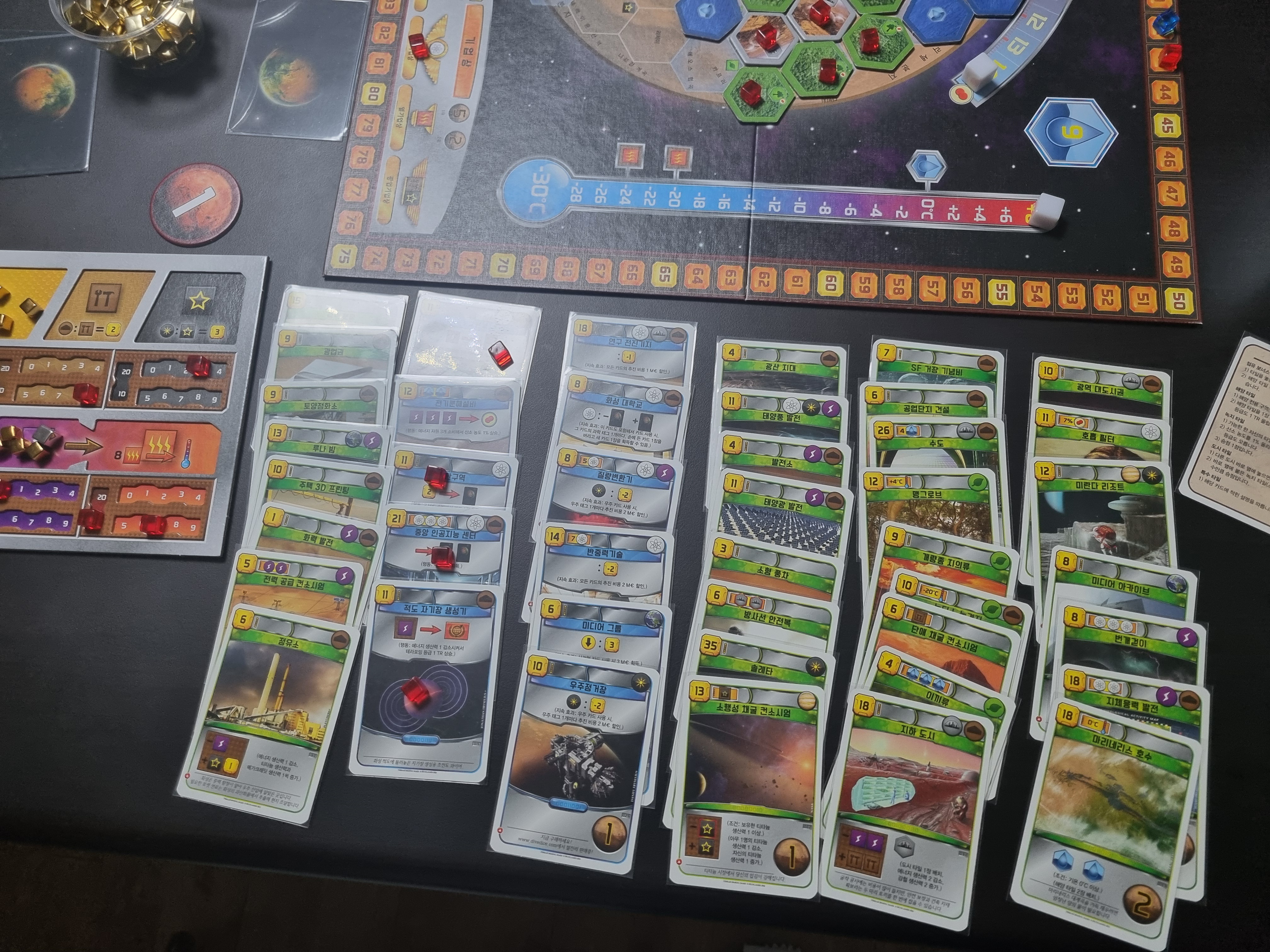 카드 드로우 운에 좌지우지 되는 느낌이 많이 들긴합니다. 카드 확보처럼 가격대비 효과가 우수한 카드를 선별하고, 기업 카드 효과와 시너지가 날만한 카드들을 선별하고, 자원을 관리하면서 그 카드들을 내려놓습니다. 게임 플레이 유형은 크게 두 가지 카드 플레이와 타일 플레이로 나뉩니다. 카드 플레이에 치중하는 사람은 빨간색 사건형 카드로 테라포밍 지수를 급격히 올린다거나 파란색 행동 카드로 자원을 모아 점수를 획득합니다. 타일 플레이에 치중하는 사람은 식물 자원과 도시 타일을 깔 수 있게 해주는 카드를 위주로 깔면서 타일 점수를 확보합니다. 맵에 따라, 확장 유무에 따라 카드 플레이가 좋은지, 타일 플레이가 좋은지 나뉩니다. 그러나 모든 걸 아우르는 전략은 최대한 카드를 많이 뽑으면서 좋은 카드를 확보하는 것에 있습니다.