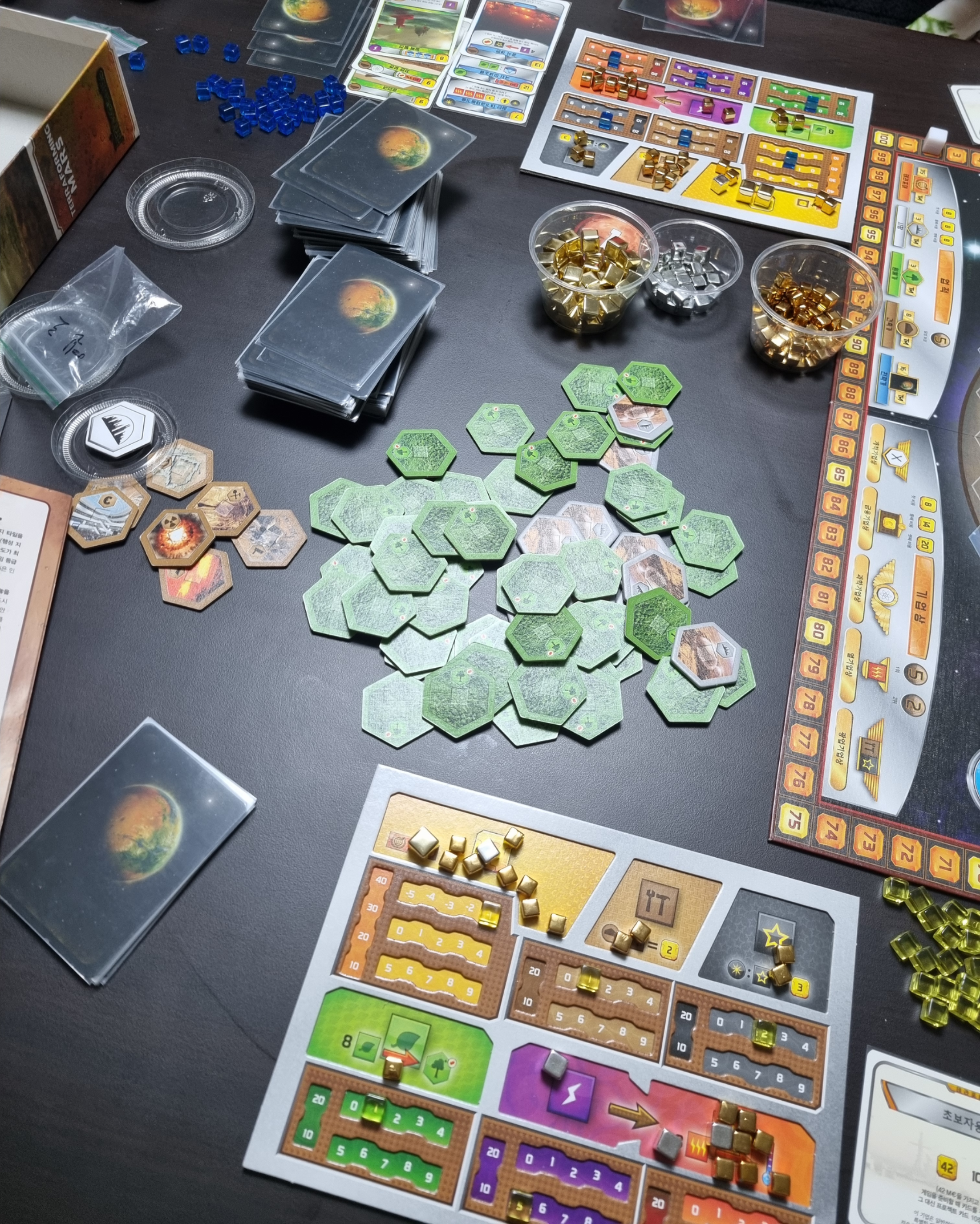 단점이라면 지칩니다. 하고나서 피곤하게 하는 요소가 크게 3가지 있습니다. 첫 번째는 카드 텍스트입니다. 시작 전 기업 카드 2장을 읽고 1장을 선택한 뒤, 프로젝트 카드 10장을 보고 가질 카드를 선택해야 합니다. 그리고 게임이 보통 10~11세대 진행되기 때문에 매차례 프로젝트 카드 4장씩 얻는 것을 감안하면 게임이 종료될 때까지 40장 정도의 카드를 봅니다. 기본적으로 총 50장의 카드는 반드시 봐야하는 것이죠. 그런데 게임 도중 프로젝트 카드 능력이나 타일 배치를 통해 획득하는 카드도 있습니다. 카드 게임 특성상 가능한 최대한 많은 카드를 보고 그 중 알짜배기를 잘 골라내는 사람이 승률이 높을 수밖에 없습니다. 그래서 한 게임에 최소 카드 60~ 70장은 본다고 보면 됩니다. 여기에 더해 카드 드래프팅을 진행하면 상대 카드까지 읽어보므로 곱하기 2를 해야합니다. 카드 드래프팅을 배제하기엔 카드 운빨 게임이 되기 때문에 초심자가 아닌 이상 어쩔 수 없이 넣게 됩니다. 결론적으로 매 게임마다 카드를 100장 이상을 읽어야 합니다.