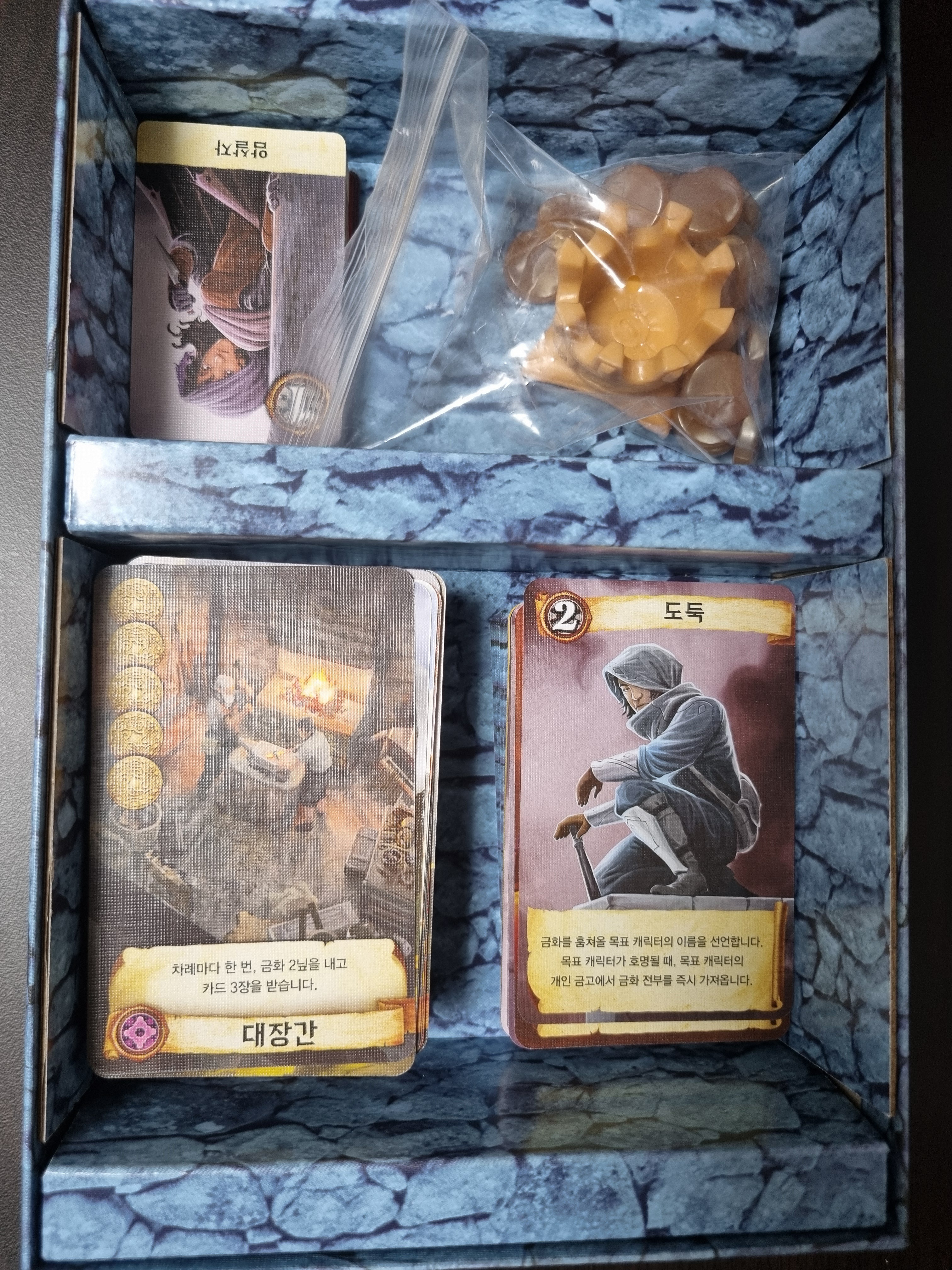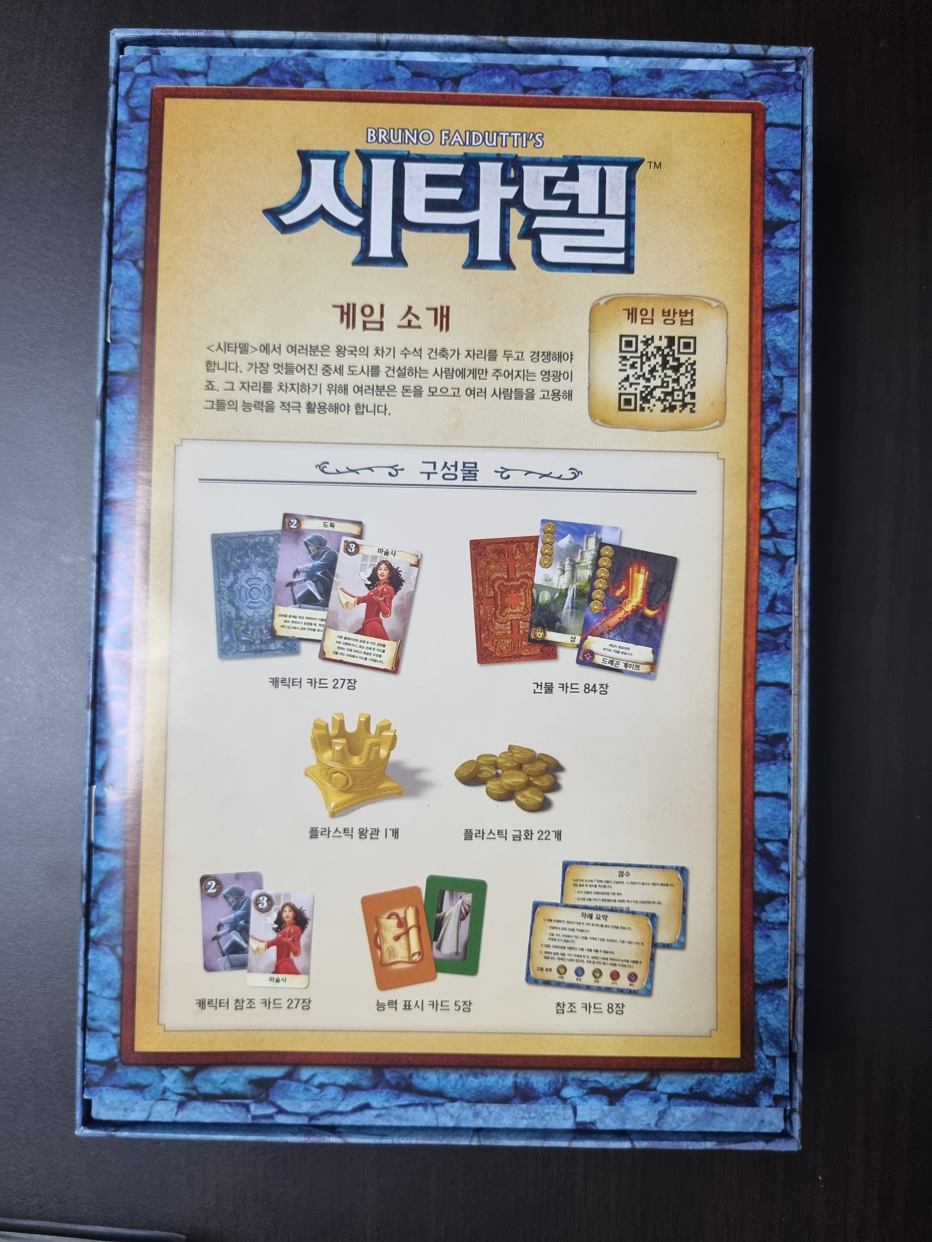 캐릭터 카드 27장, 건물 카드 84장, 플라스틱 왕관 1개, 플라스틱 금화 22개, 캐릭터 참조 카드 27장, 능력 표시 카드 5장, 참조 카드 8장입니다. 필요한 것들이 군더더기 없이 들어 있고, 플라스틱 왕관과 플라스틱 금화 촉감 만족합니다. 카드 퀄리티도 무난하거나 괜찮은 편입니다.
