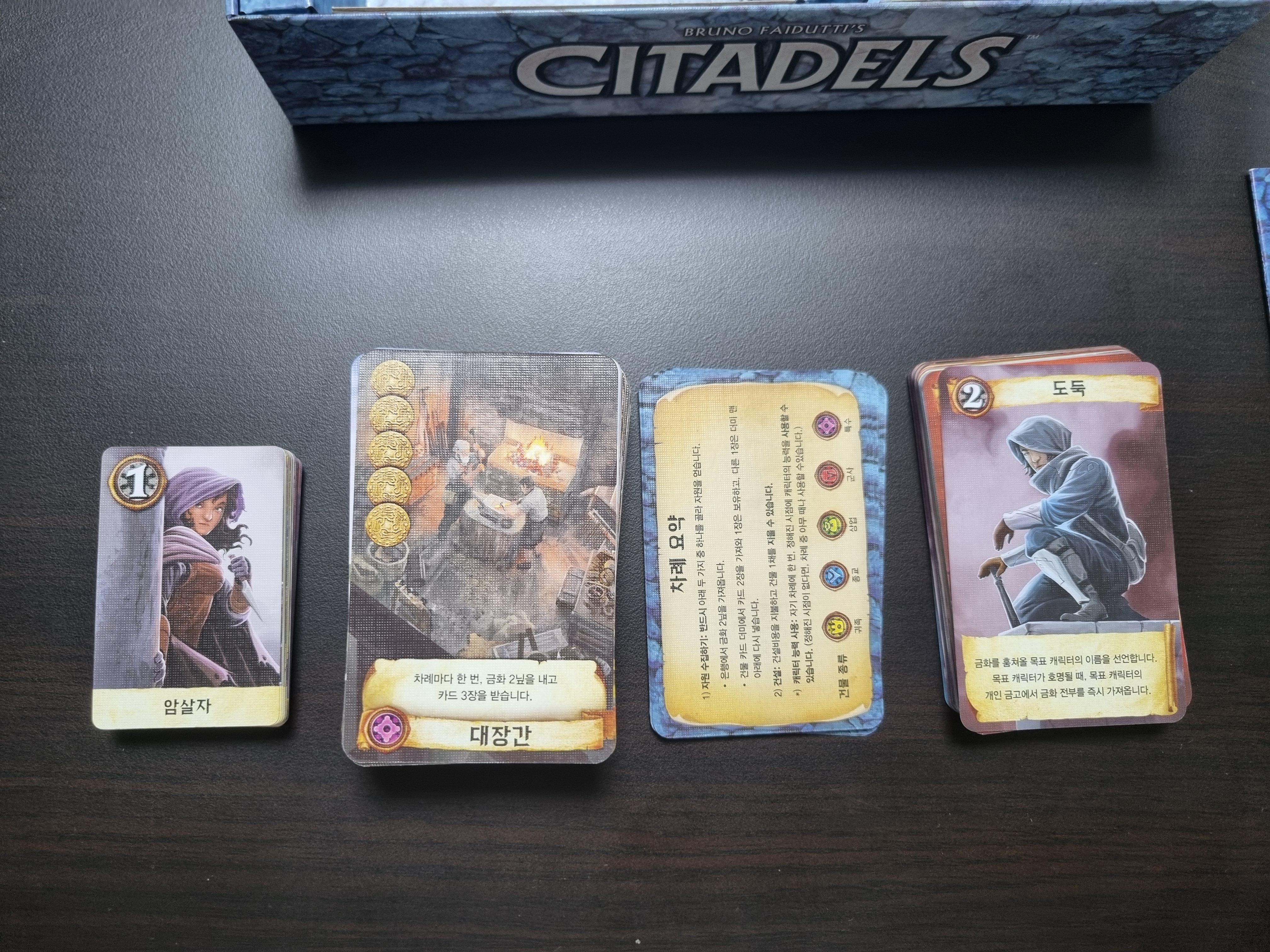 도시에서 벌어지는 음모 협잡 컨셉입니다. 역할 카드 덕분에 테마 몰입도가 꽤 있습니다. 수 틀리면 죽여버리는 무자비한 중세 도시 느낌 물씬납니다.