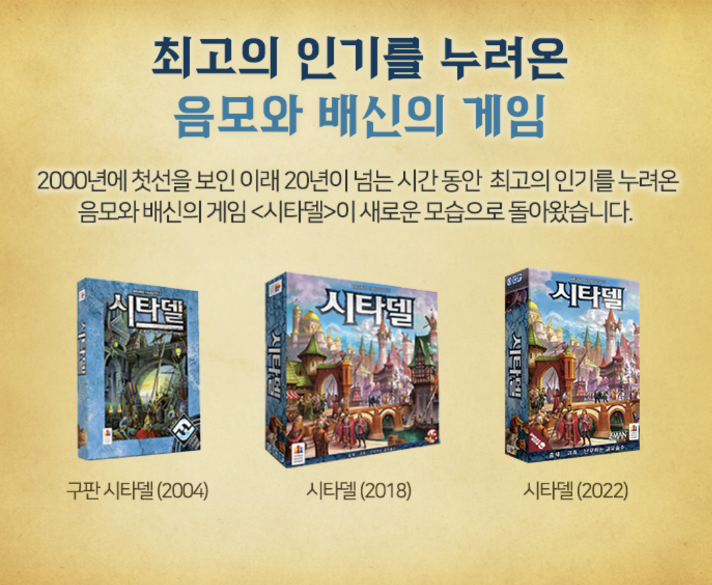음모와 협잡이 난무하는 2000년에 출시된 고전 게임입니다. 승리 목표는 건물 7개를 지어 승점을 가장 많이 획득하는 것입니다. 기본 게임 기준 1부터 8번에 해당하는 역할이 있습니다. 돌아가며 캐릭터를 선택한 뒤 1번부터 차례를 진행합니다. 1번은 자신을 제외한 번호를 호명해 죽이고, 2번은 자신을 제외한 번호를 호명해 돈을 뺏습니다. 3번은 건물 카드를 바꿀 수 있고, 4번은 역할 선택 선을 가져옵니다. 5번은 장군의 공격에 면역, 6번은 돈을 더 받습니다. 7번은 건물을 많이 지을 수 있고, 8번은 상대 건물을 파괴합니다. 자기 차례가 되면 금화 2닢을 받거나 건물 카드 더미에서 2장을 보고 1장을 가질 수 있습니다. 그리고 선택적으로 비용을 지불하고 건물을 지을 수 있습니다.