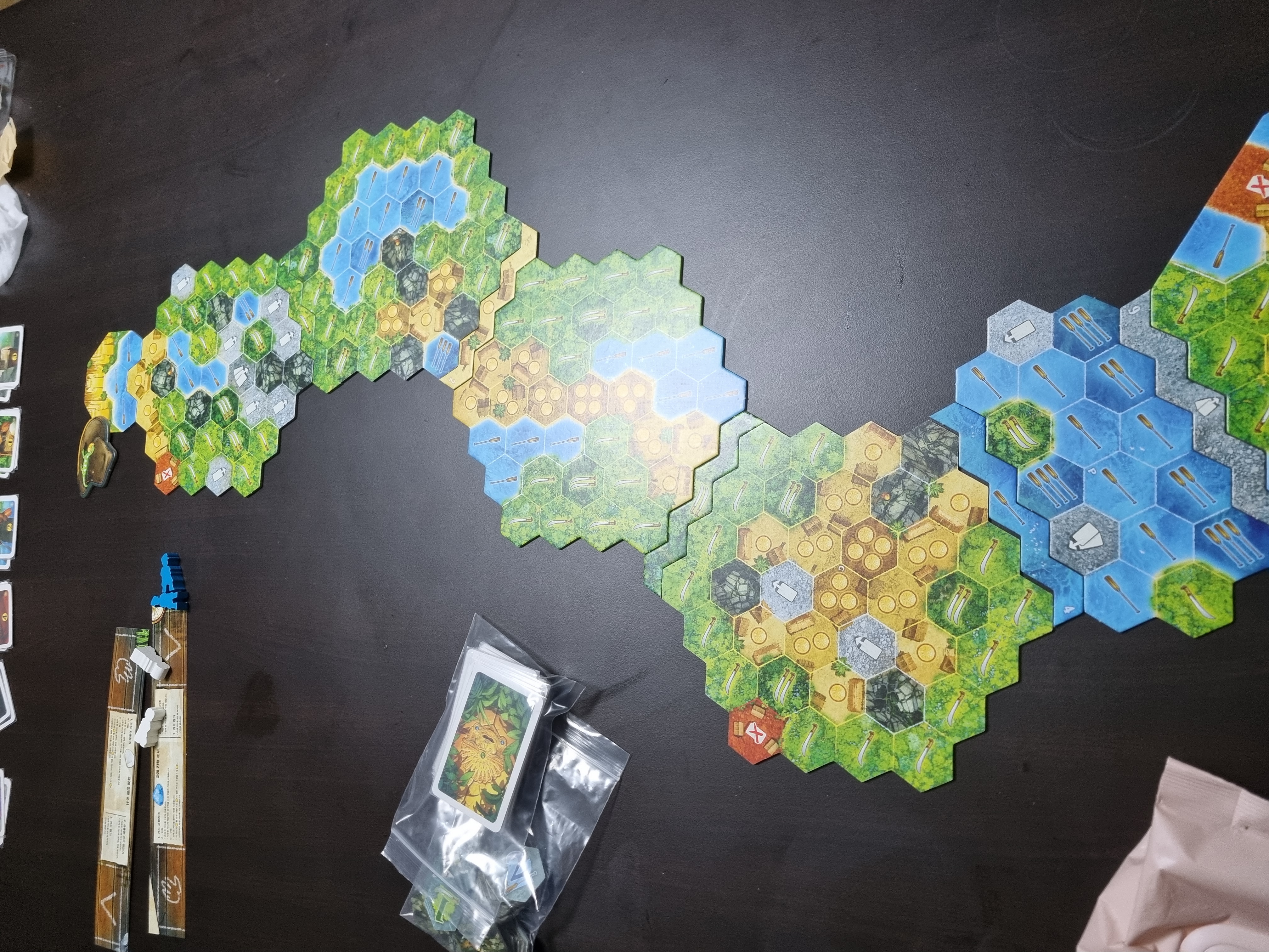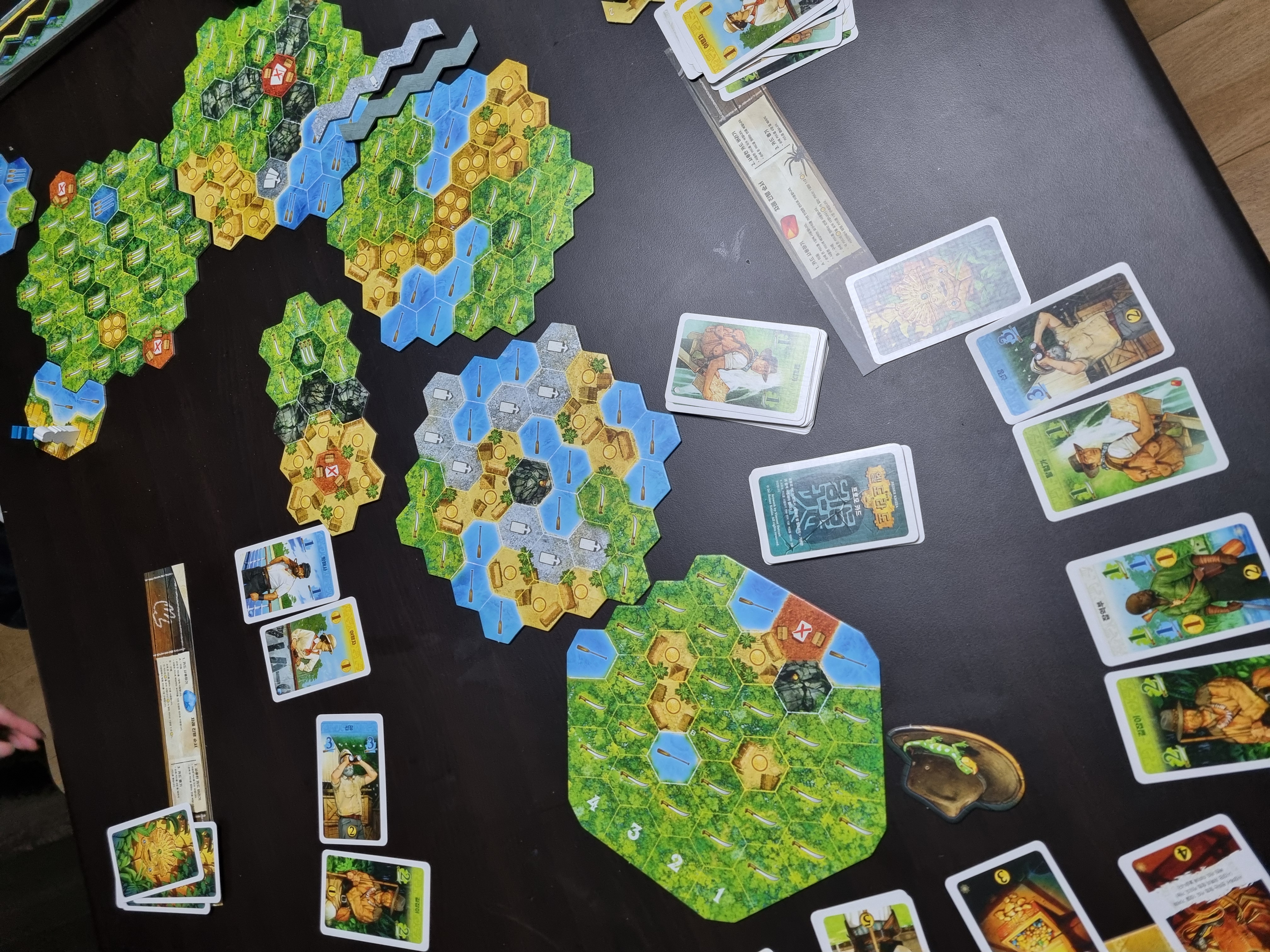 룰이 매우 직관적이고 간단합니다. 자신이 가려는 지형 타일에 맞는 값만 지불하면 이동할 수 있고, 도착 지점까지 1등으로 도착하면 됩니다. 보드게임을 전혀 해보지 않은 사람들도 충분히 즐길 수 있는 난이도 입니다. 문제라면 세팅이 귀찮습니다. 시장에 카드를 나열하는 것보다 특히 맵을 조립하는 게 번거롭습니다. 지도를 보고 6~7개의 양면 지형 타일을 방향에 맞춰 꽂아야 합니다. 근데 이런 번거로움은 기꺼이 참을 수 있을만큼 게임이 너무 재밌습니다. 그리고 정리는 세팅에 비하면 쉽습니다.