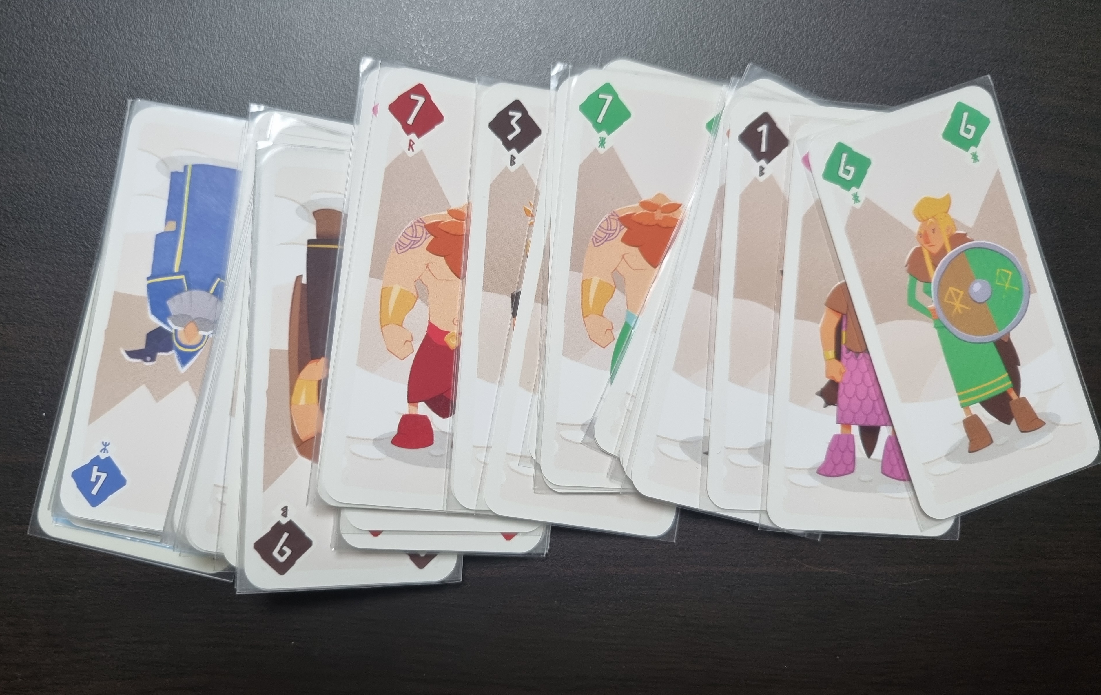 카드 54장으로 즐기는 클라이밍 게임입니다. 독특한 점은 바이킹 테마인데 김건희, 황소망, 고태윤 작가가 만든 한국 게임입니다. 2025년 프랑스 칸 국제 보드게임 페스티벌에서 수여하는 올해의 게임상을 받았습니다. 카드를 섞어 플레이어들은 9장씩 나눠 가집니다. 선 플레이어부터 시계 방향으로 돌아가며 같은 색깔 혹은 같은 숫자 조합으로 카드를 낼 수 있습니다. 그 다음 사람부터는 카드 장 수를 맞춰 더 높은 숫자 조합을 내야 합니다. 이때 앞 사람이 낸 카드 더미 중에서 한 장을 패로 가져와야 합니다. 이런식으로 차례를 반복해 누군가 손패를 모두 털면 게임이 종료되고, 들고 있는 카드 장 수만큼 벌점을 받습니다. 누군가 벌점 15점을 얻는다면 게임이 종료됩니다.