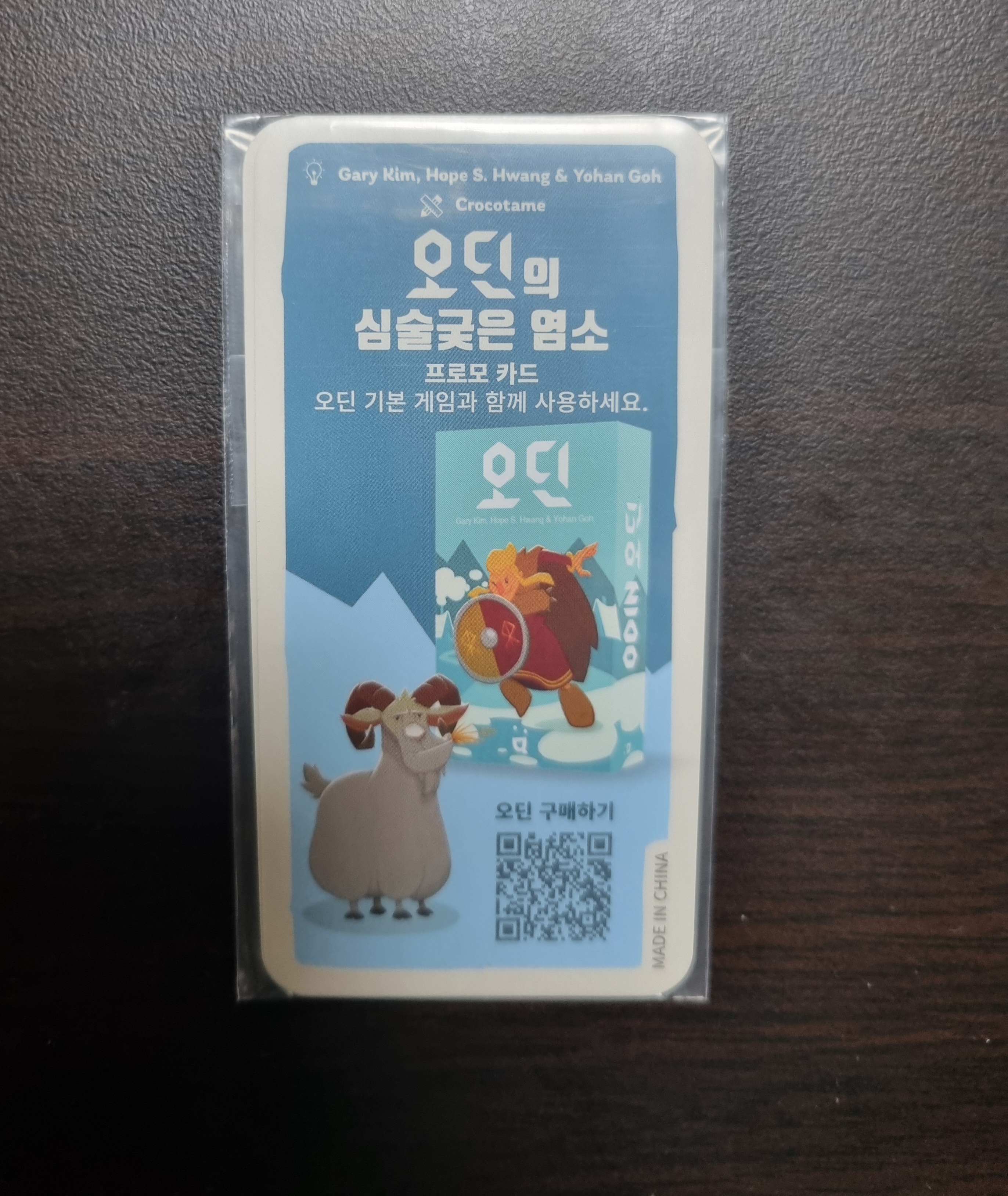 염소 프로모 카드는 초판의 경우 포함되어 있지 않았습니다. 오딘 2쇄?(추정)부터 프랑스에서 상을 받은 것을 기념하기 위해 한 장씩 동봉하여 판매하였습니다. 그리고 초판 구매자들을 위해 각종 이벤트로 염소 프로모를 뿌리기도 했습니다. 보드게임 콘에서 행사를 참여하면 무료로 준다거나 아레나 오딘 토너먼트를 개최해 참여자 모두에게 무료로 택배 배송을 해주기도 했습니다. 저 또한 초판 구매자이고, 오딘 토너먼트에 참여해 프로모 카드를 추가로 얻었습니다. 개인적으로 염소 프로모는 단조로운 오딘에 별사탕 역할을 해서 필수라고 생각합니다. 구할 수만 있다면 2장, 3장씩 넣는 게 좋습니다. 1장은 패에 안 뽑혀 나오는 경우가 있어 좀 아쉽습니다. 2장을 한꺼번에 먹는 경우가 나오지 않냐 물을 수 있는데, 어차피 오딘은 운 게임같아서 차라리 그 부분을 극대화하는 게 더 파티성도 살고 손맛이 좋았습니다. 빠르게 2, 3판 즐기기 좋아집니다.