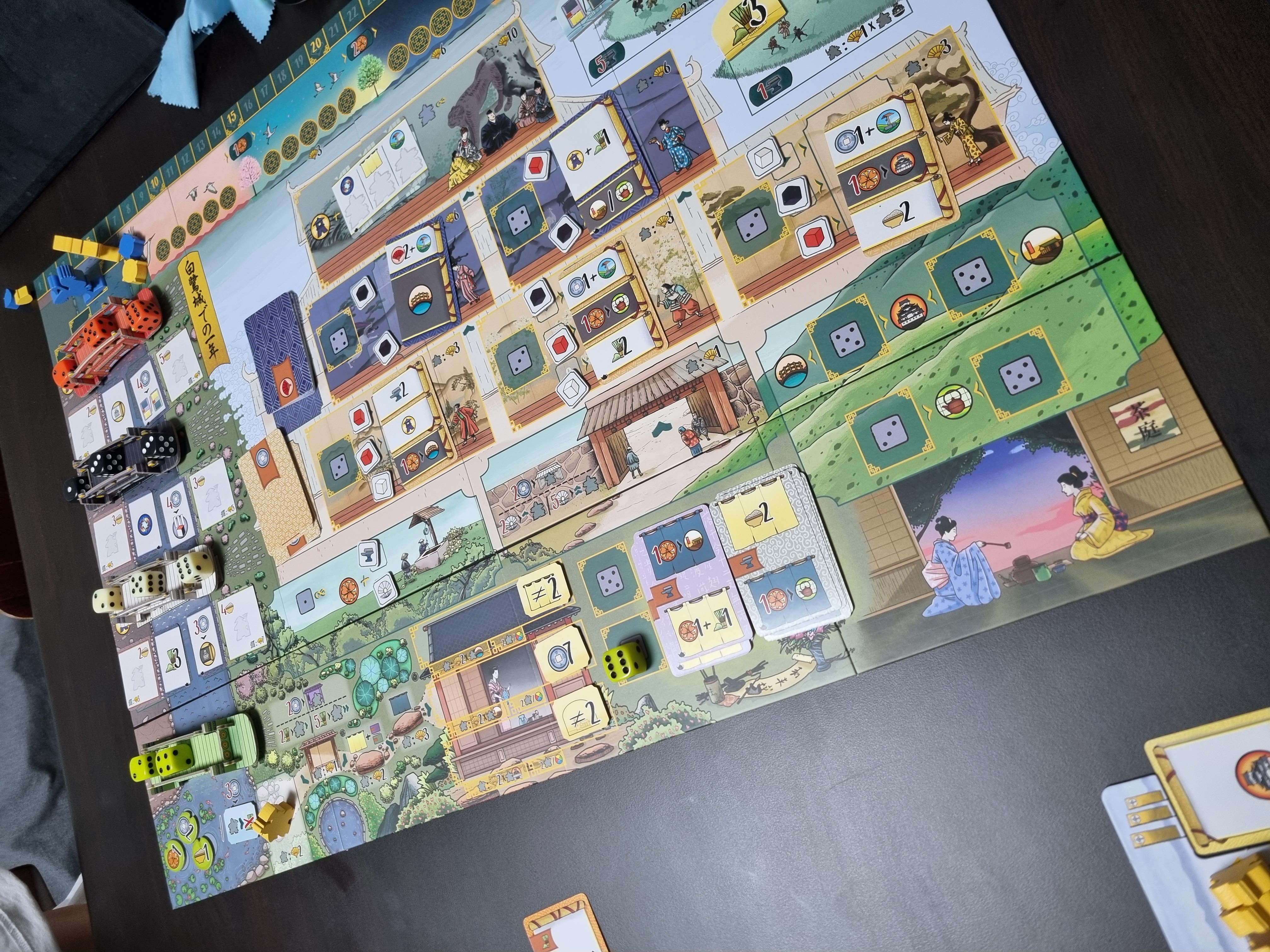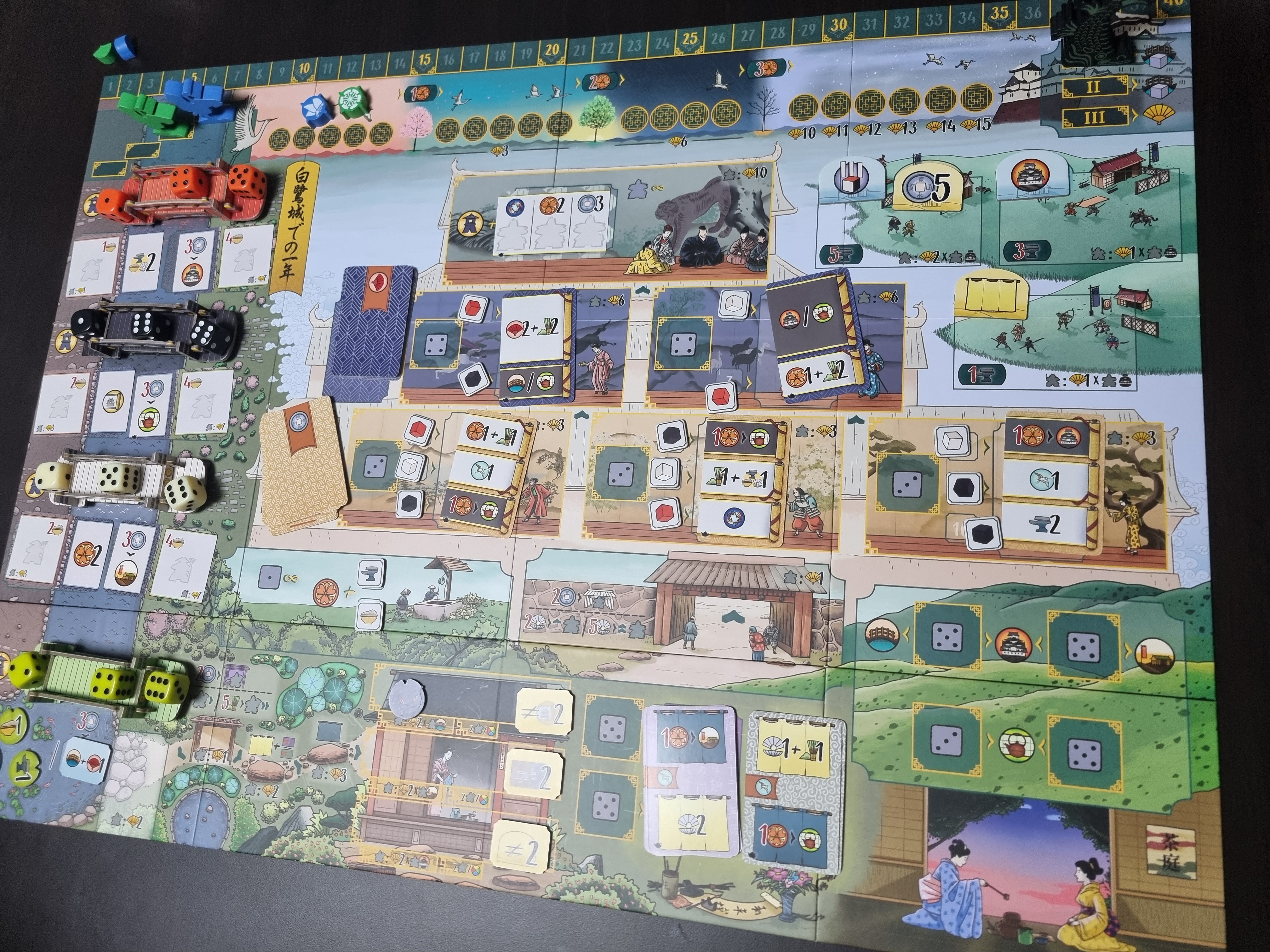 백로성과 동일하게 유로 게임 수준으로 건조하긴 하지만, 디자인에 제가 선호하는 일본풍의 유려함이 있습니다. 내 가문 사람들을 백로성 곳곳에 배치한다 정도만 테마가 느껴집니다. 일꾼에 ㅎㅅㅎ 스티커를 붙이면 분위기가 조금 더 살아서 백로성을 자주 돌리신다면 추천드립니다.