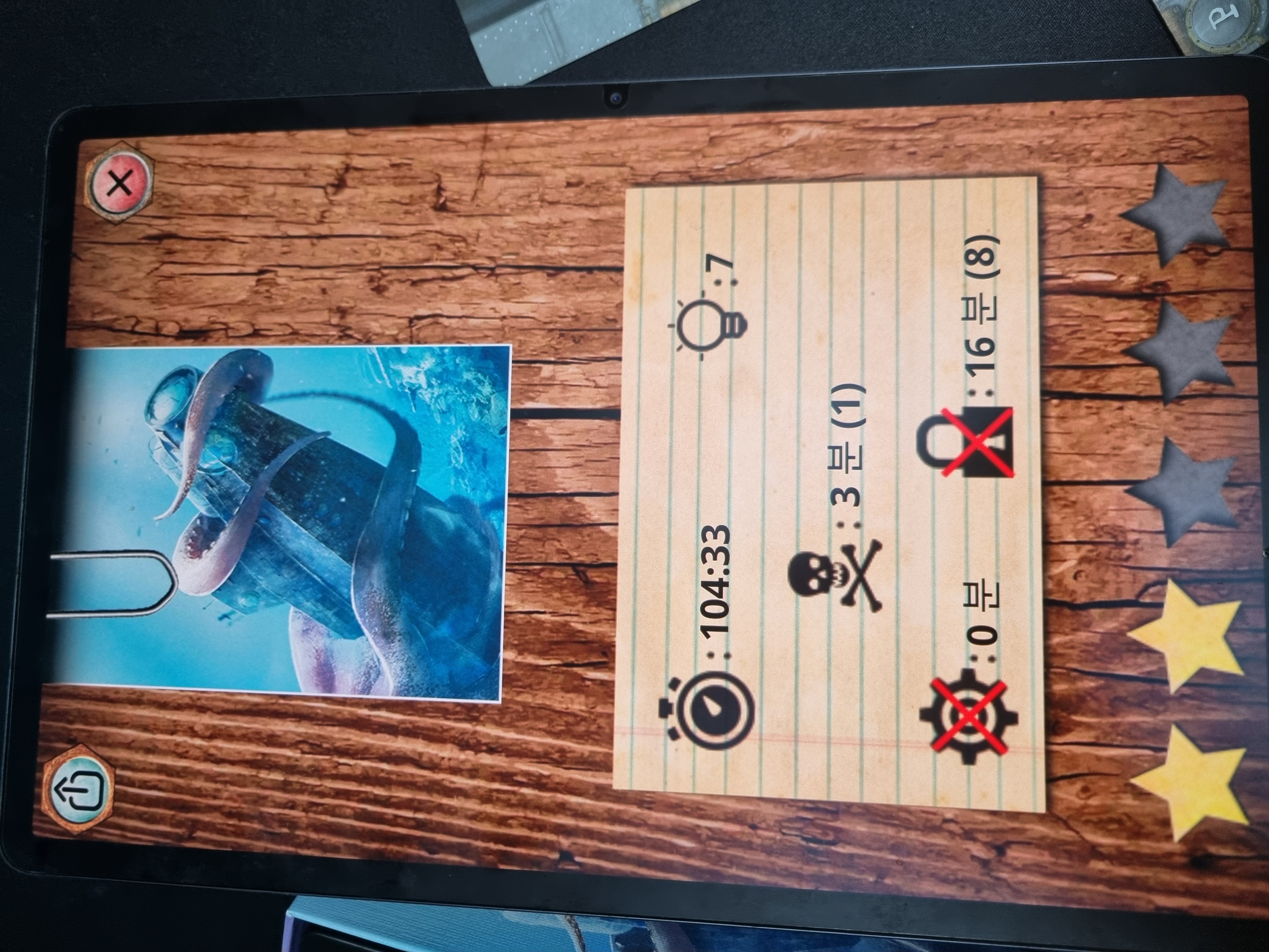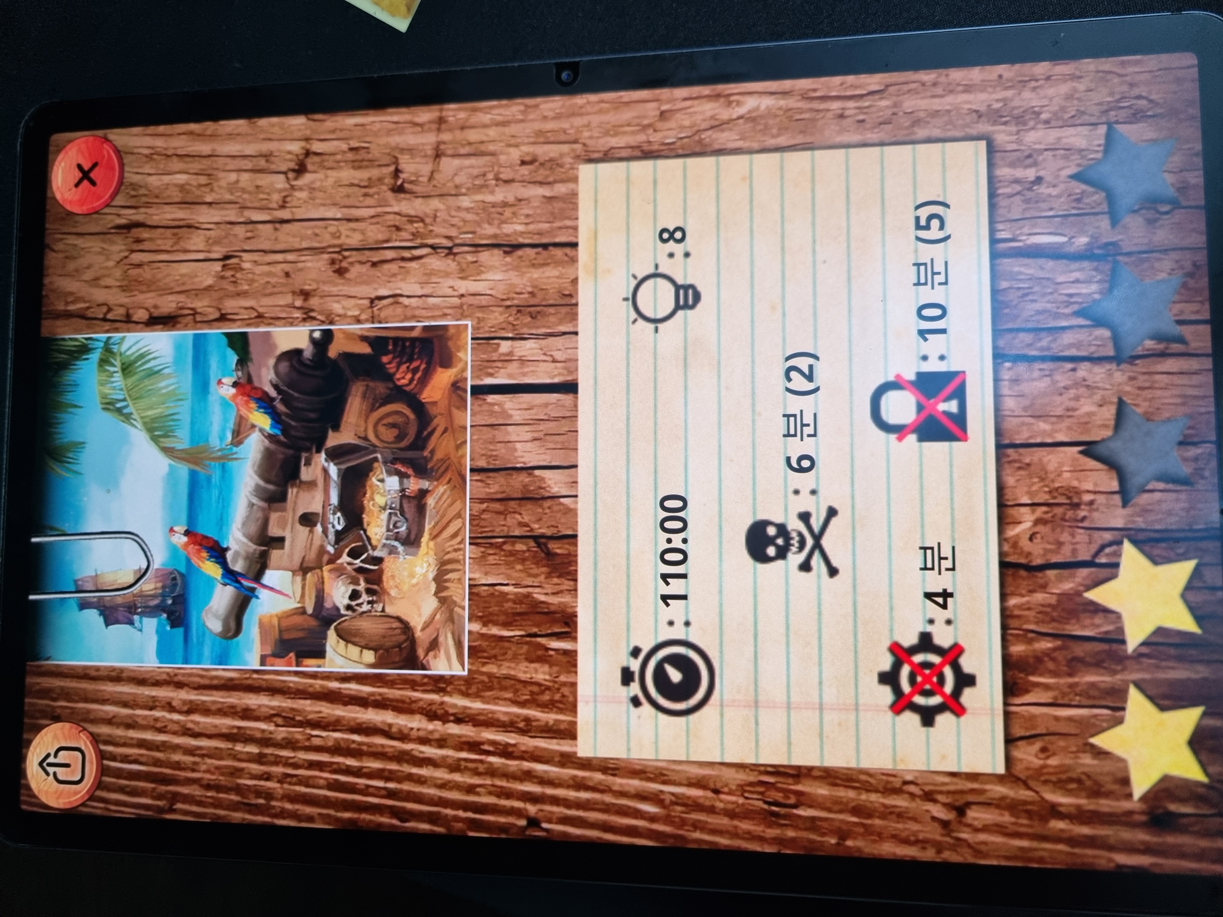 토니팔 섬의 진귀한 보물은 해적, 어드벤처 테마에 기계 장치 활용이 강조되어 있습니다. NPC들이 등장해 내러티브가 강조되어 테마가 잘 느껴져 좋았고, 기계 장치가 적극적으로 활용되면서 재밌는 기믹들이 많았습니다. 초중반엔 이게 난이도 3이 맞나 싶을 정도로 진행이 수월했습니다. 그러나 후반부에 갈피를 잡기 힘든 문제가 많아 시간도 많이 까먹고 힌트도 남발했습니다. 그래도 심연에 비하면 개연성이 떨어지는 문제가 적었다고 생각합니다. 심연과 다른 느낌으로 피로도를 높이는 문제가 한 두 개 있긴한데, 나머지는 직관적입니다. 임팩트가 커서 게임 종료 후 굉장히 뿌듯하고 만족감이 높았습니다.