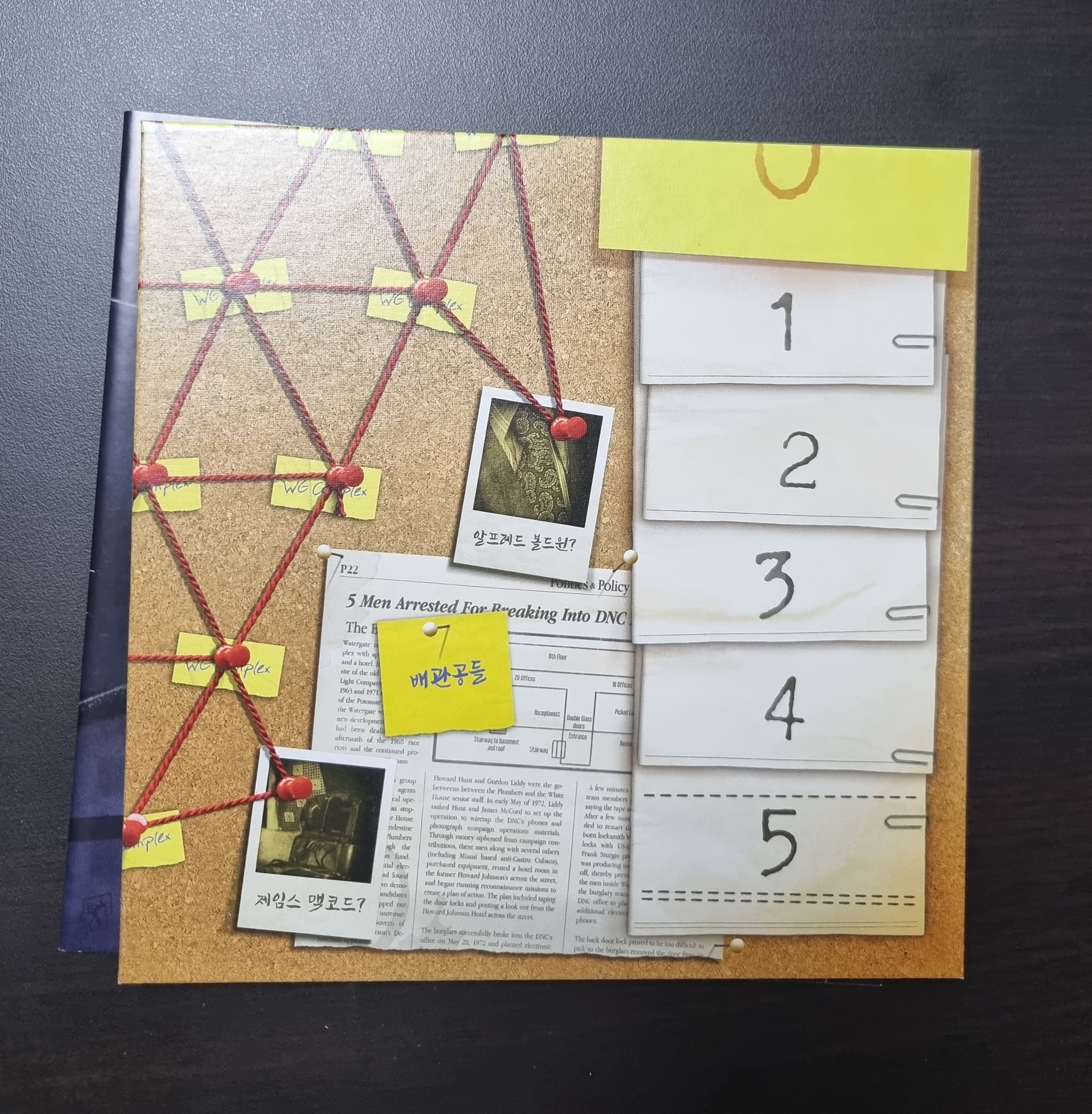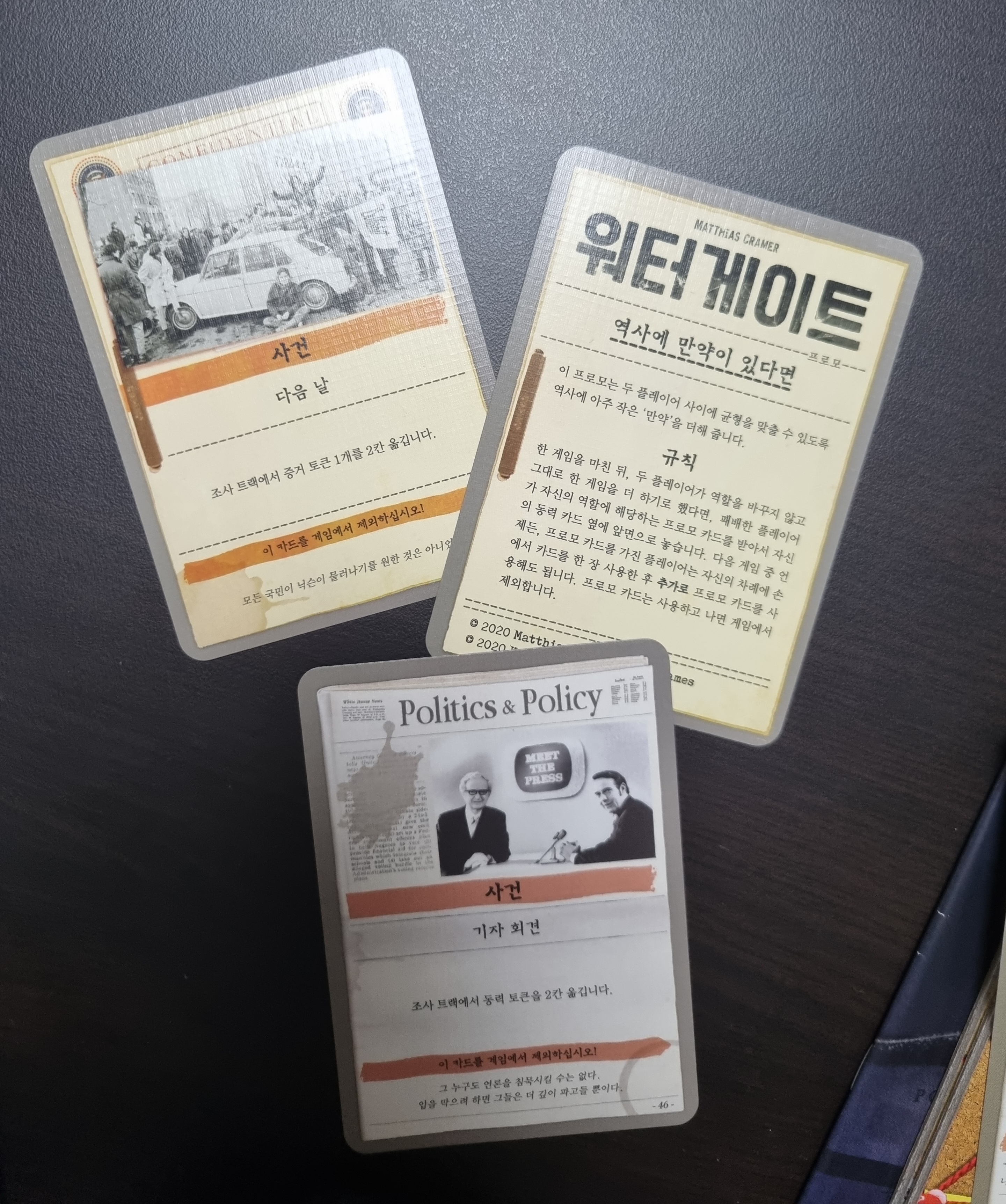 미국의 정치 스캔들을 배경으로 한 카드 게임입니다. 한 사람은 리처드 닉슨 대통령을 맡아 치부를 은폐하기 위해 동력 토큰을 5개 모아야 하고, 한 사람은 기자를 맡아 제보자 2명을 단서로 대통령과 연결해 진실이 드러나도록 해야합니다. 기본적으로 줄다리기 게임입니다. 카드에는 증거 타일, 주도권 마커(선 플레이어), 동력 마커를 자기 쪽으로 옮길 수 있게 해주는 수치와 다양한 효과가 있습니다. 수치를 사용하면 카드를 버린 더미에 두고, 효과를 사용하면 그 카드는 게임에서 제외됩니다. 카드 효과가 수치에 비해 강력한 게 많습니다.