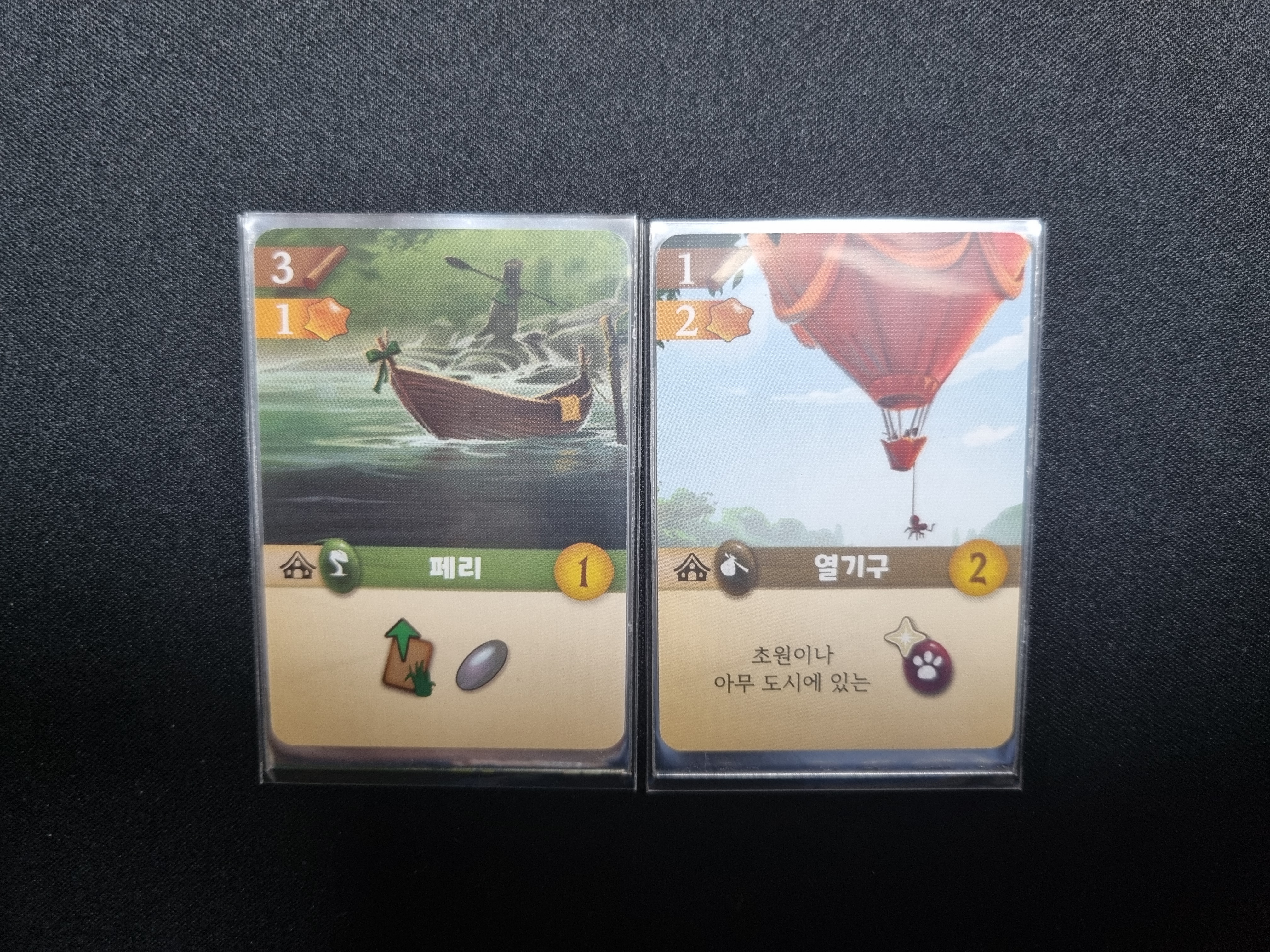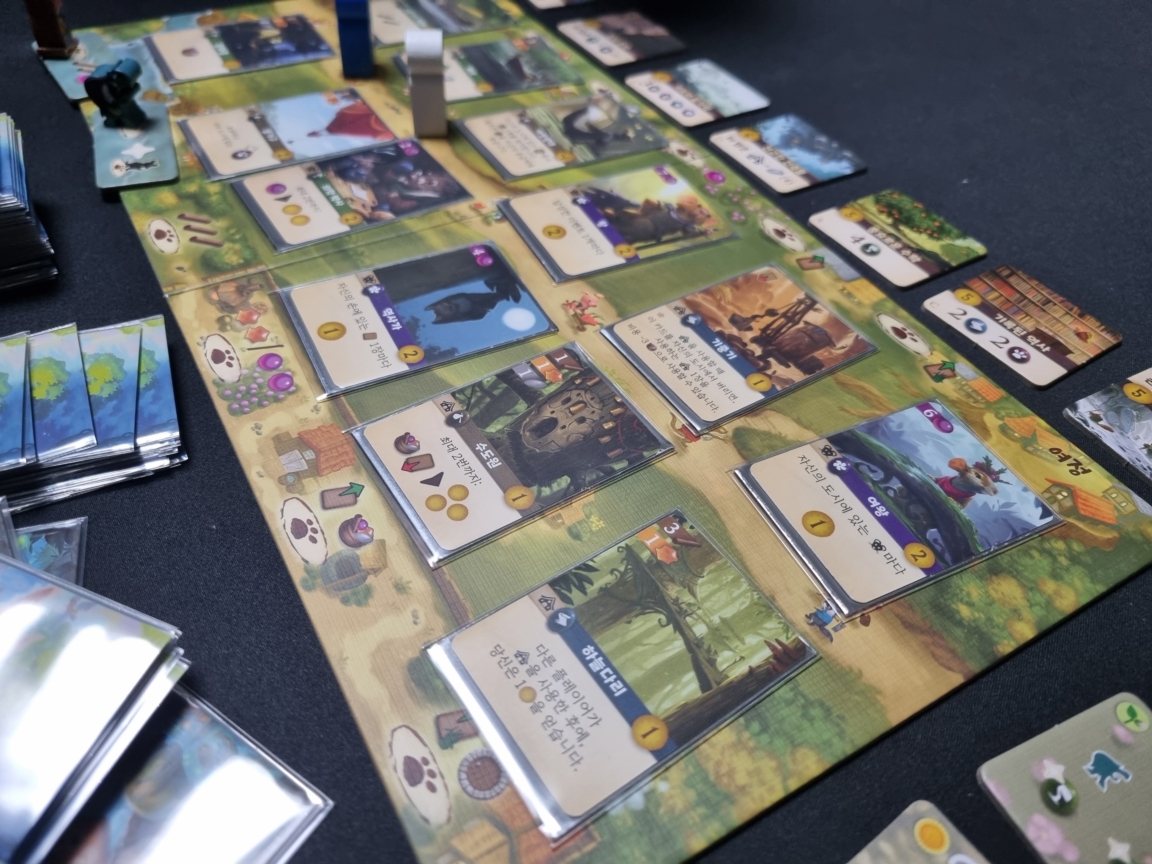 2인용이라 세팅이 간단한 편이고, 액션도 3가지 뿐이라 룰 설명도 어렵지 않습니다. 귀여운 동물 테마라 남녀 호불호도 적을 것 같습니다. 다만, 처음하면 뭘 해야할지 참 난감합니다. 오픈 되어 있는 카드 12장에 이벤트 카드도 8장이고, 강 지역 2칸에 농장 지역 4칸, 내가 들고 있는 2~3장의 카드까지 고려해 첫 발을 떼야하다보니 운영이 쉽지 않습니다. 카드 텍스트 압박이 있습니다.