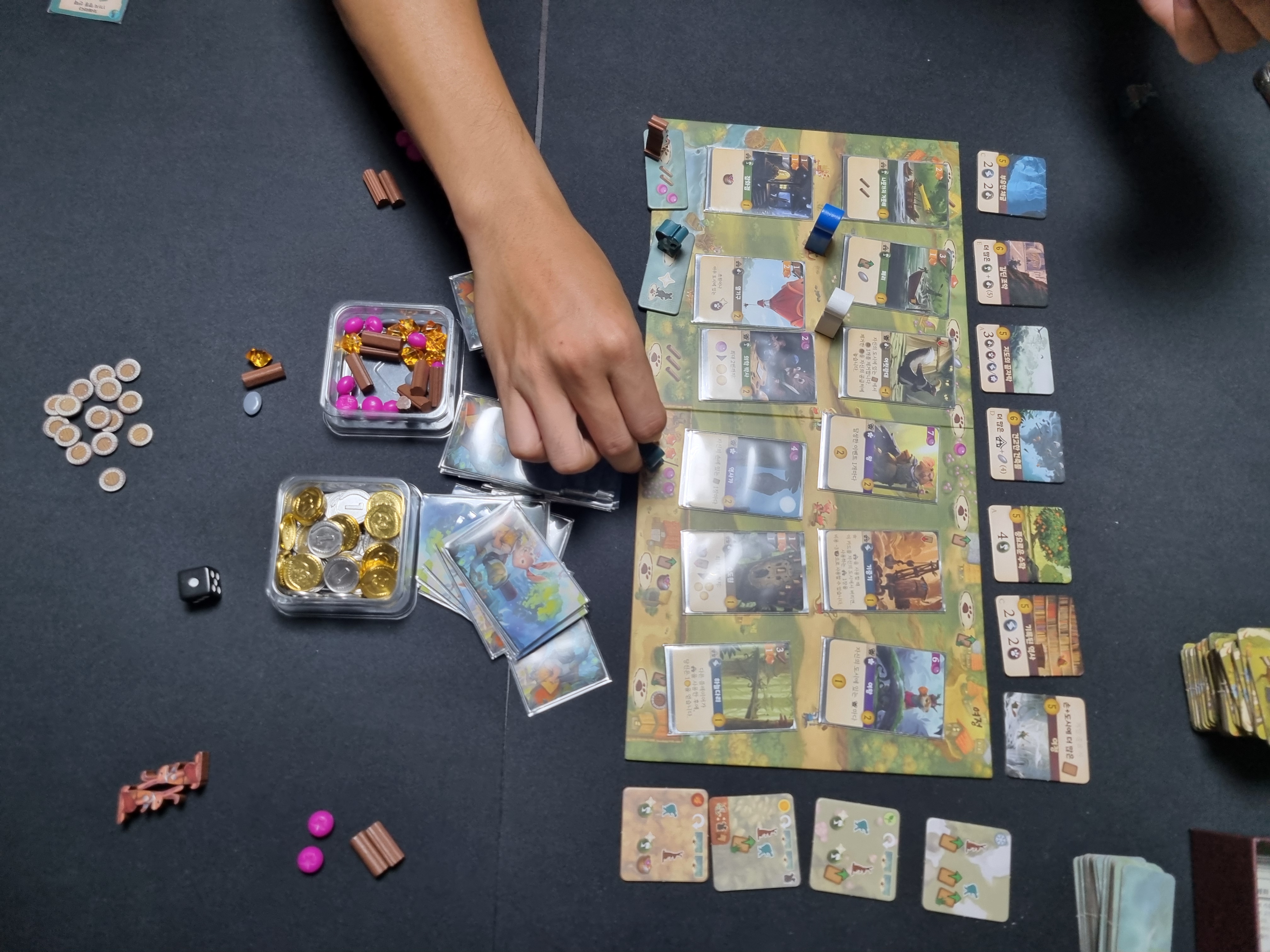 내가 어떤 액션을 하느냐에 따라 게임판 중앙에 있는 해 토큰과 달 토큰을 한 칸씩 이동시킵니다. 그리고 해 토큰과 달 토큰 주변에 있는 카드는 별도의 카드 가져오기 액션을 취하지 않고 곧 바로 도시에 내려놓을 수 있습니다. 일꾼 놓기 베이스다 보니 초반엔 효율이 높은 강 타일 선점 싸움이 심하고, 해 토큰과 달 토큰 위치에 따라 효율 높은 카드를 선점하는 눈치 싸움도 있습니다. 그리고 마냥 모든 정보가 오픈되어 있는 게 아니라 내가 손에 들고 있는 카드도 있기 때문에 여러 전략을 취할 수 있는 게 장점입니다.