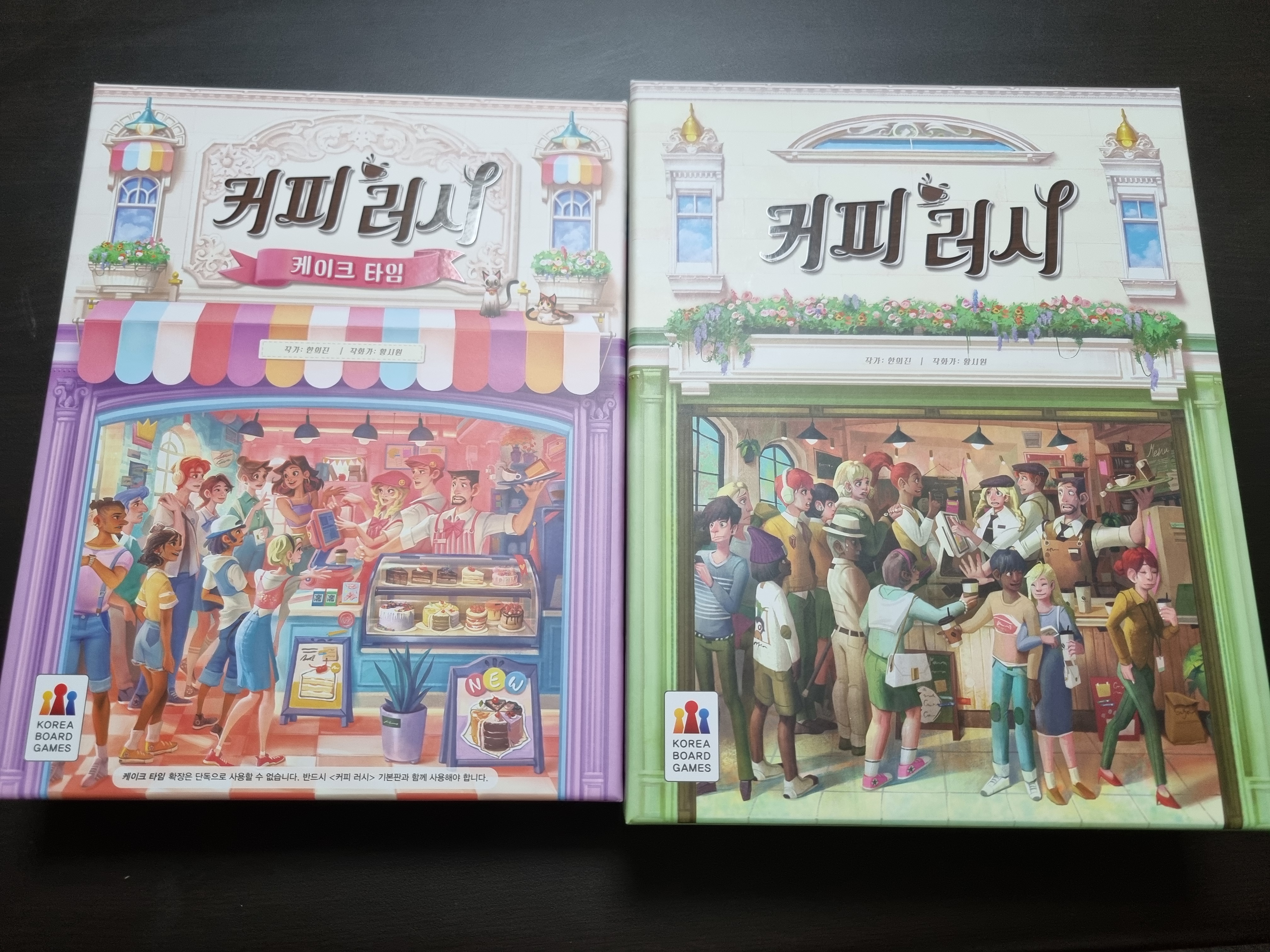 국내 작가 게임인 커피 러시의 확장판입니다. 확장판에선 케이크 카드 추가됩니다. 케이크 주문 카드를 완성하면 케이크 카드를 무작위로 1장 받을 수 있습니다. 이 카드는 원하는 재료 1개 얻기나 재료 토큰을 2개 얻는 등 자기 차례 중 언제든지 쓸 수 있는 일회성 찬스입니다.