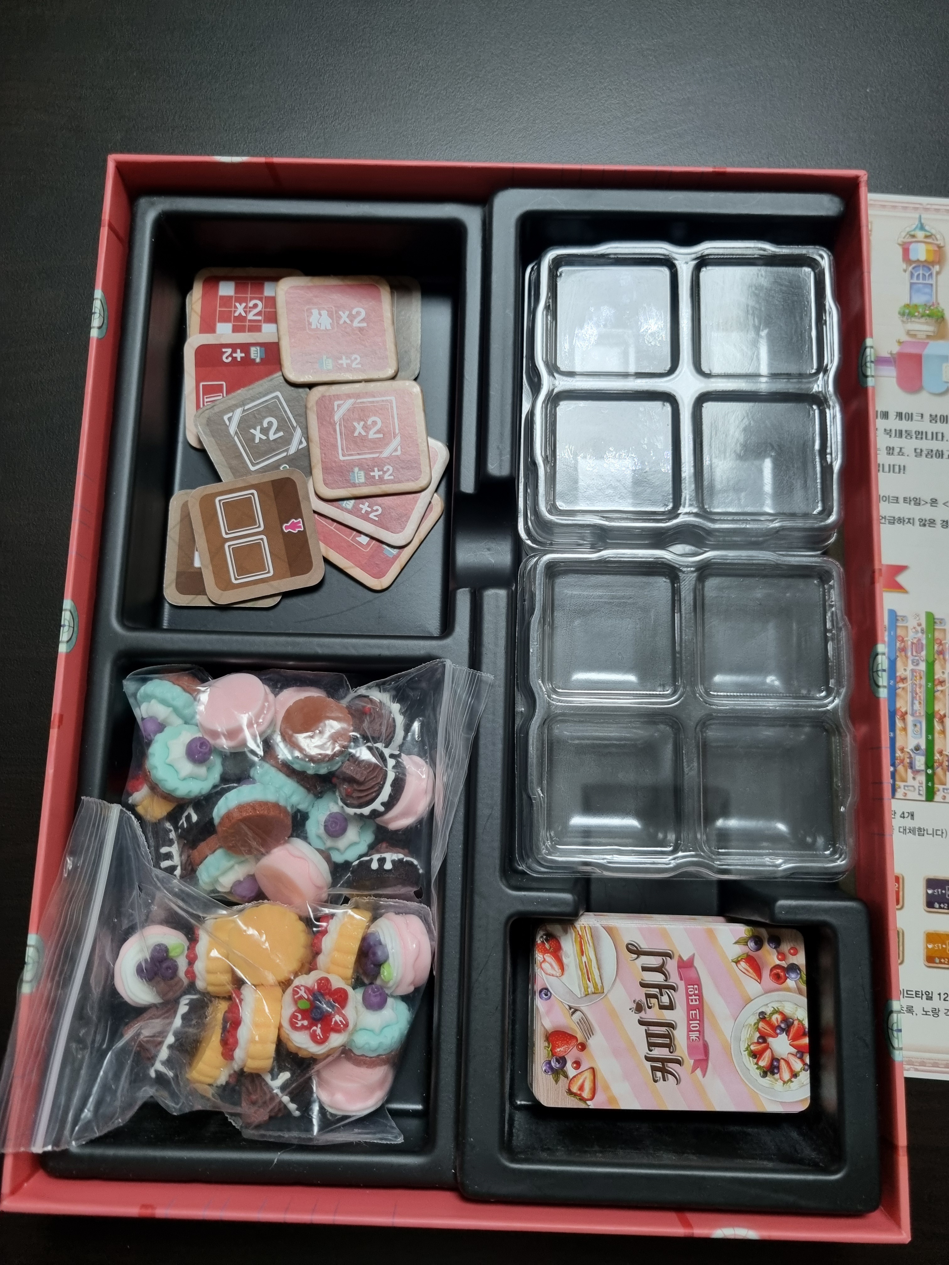 확장 개인판 4개, 케이크 카드 60장, 확장 주문카드 30장, 케이크 32개, 게임말 2개, 재료 토큰 보관함 2개, 업그레이드 타일 12개(색깔별로 3개씩), 규칙서 1부입니다.
