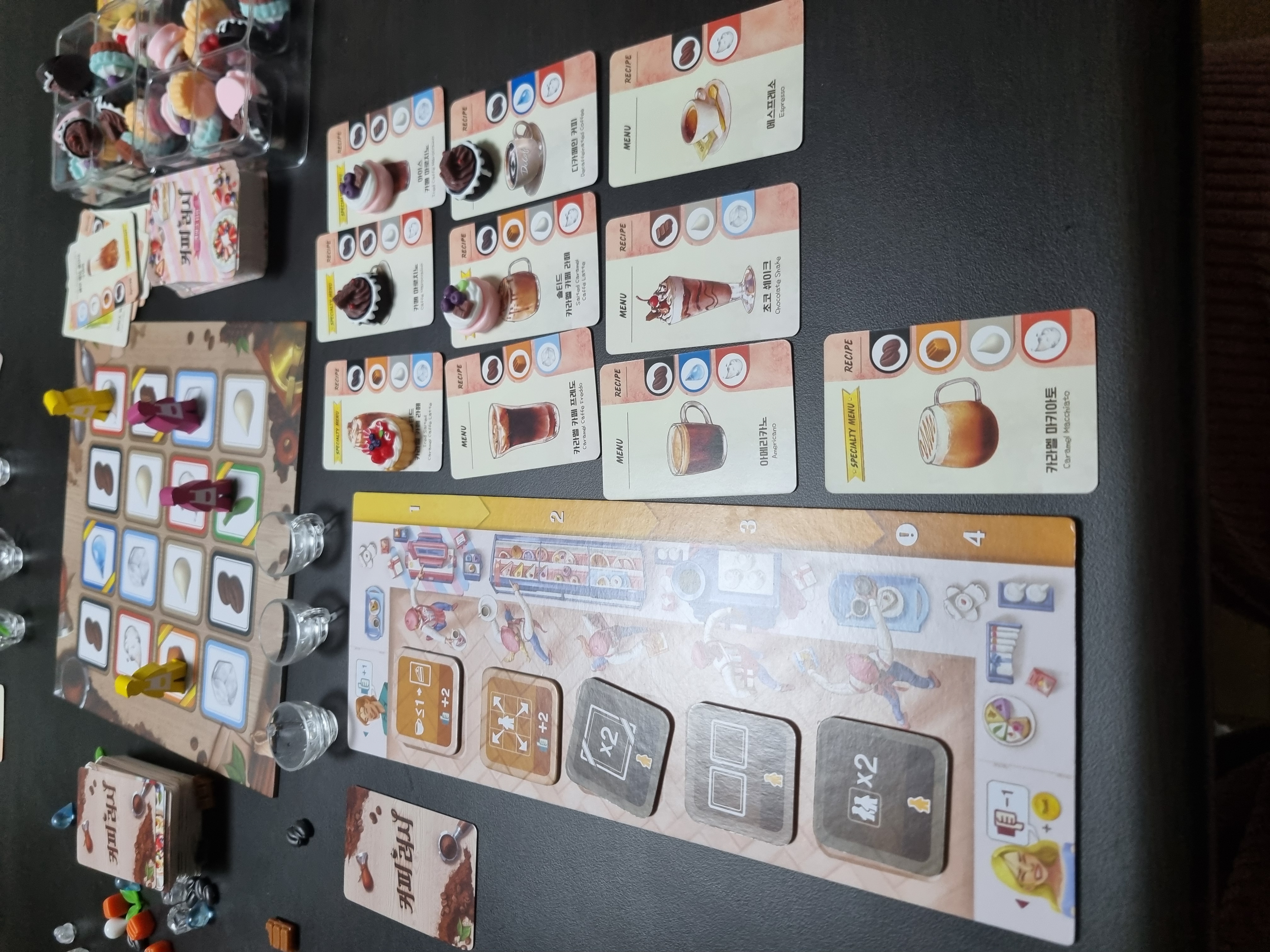 아쉬웠던 점 첫 번째는 게임의 경험을 크게 변화시키지 않는 확장이었습니다. 케이크 카드를 획득했을 때 건빵 속 별사탕을 발견한 것처럼 기분이 좋은 건 맞습니다만, 본질적으로 게임의 경험을 크게 변화시키진 않았습니다. 무작위로 뽑는 찬스 카드이기 때문에 전략에 변주를 주지도 않고, 커피 주문을 2장 정도 더 처리할 수 있게 해줄 뿐이었습니다. 플레이 타임이 살짝 늘어나죠. 케이크 컴포의 사용처는 케이크 주문서를 표시하기 위해 그 위에 올려두는 마커 역할이라 케이크 종류는 딱히 중요하지 않습니다.
