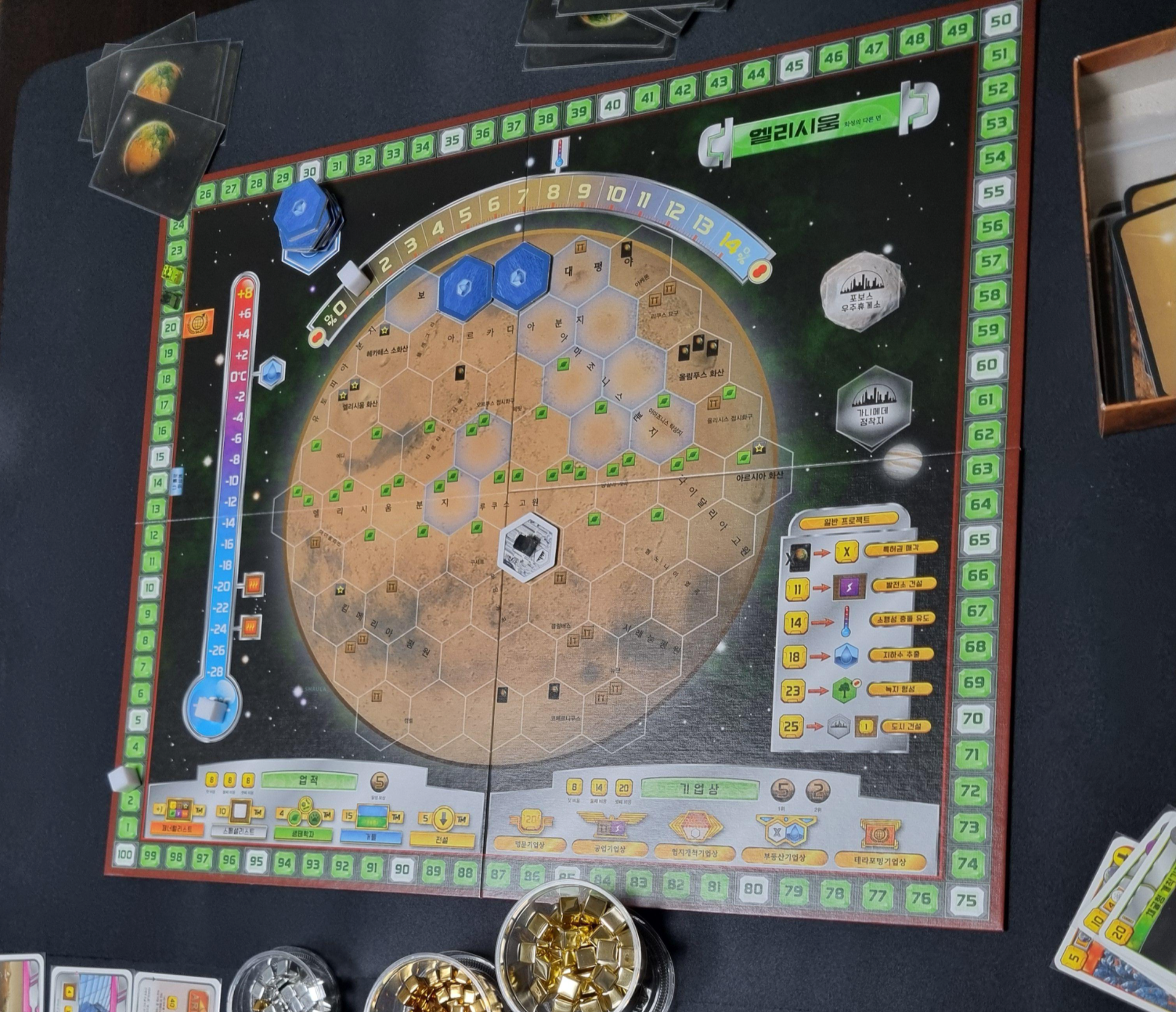 맵확장을 구매하는 이유입니다. 본판에 들어있는 맵확장은 단면이라 5~10판 정도 하다보면 익숙해지고 물리기 시작합니다. 단순히 타일을 배치했을 때 얻을 수 있는 보너스 뿐만 아니라 지도에 업적과 기업상도 고정되어 있어 게임 양상이 반복된다는 느낌이 들기 때문입니다. 그때 맵확장이 필요합니다. 헬라스 & 엘리시움이라는 이름처럼 맵확장은 지도가 양면으로 되어 있습니다. 전체적인 틀은 그대로 가져가면서 업적과 기업상, 타일 배치 보너스가 바뀝니다. 고수들 사이에선 본판 맵의 배치 보너스에 밸런스 문제가 있다고 합니다. 헬라스와 엘리시움이 그 문제를 어느 정도 해결해준다고 하죠. 하지만, 전 테포마를 수 백판까지 즐기진 않아서 밸런스 조율보단 새로운 경험을 준다는 점이 훨씬 중요했습니다.
