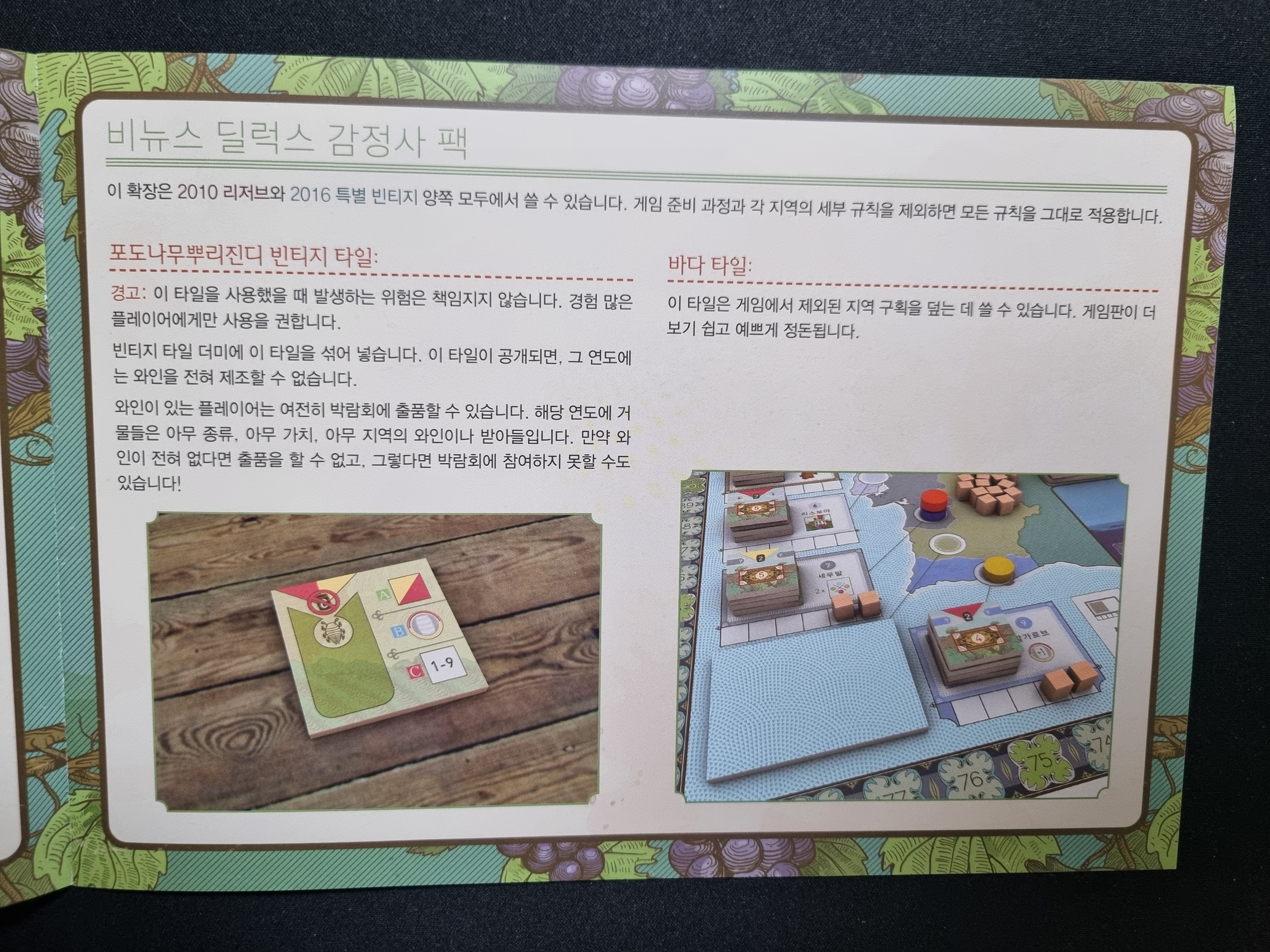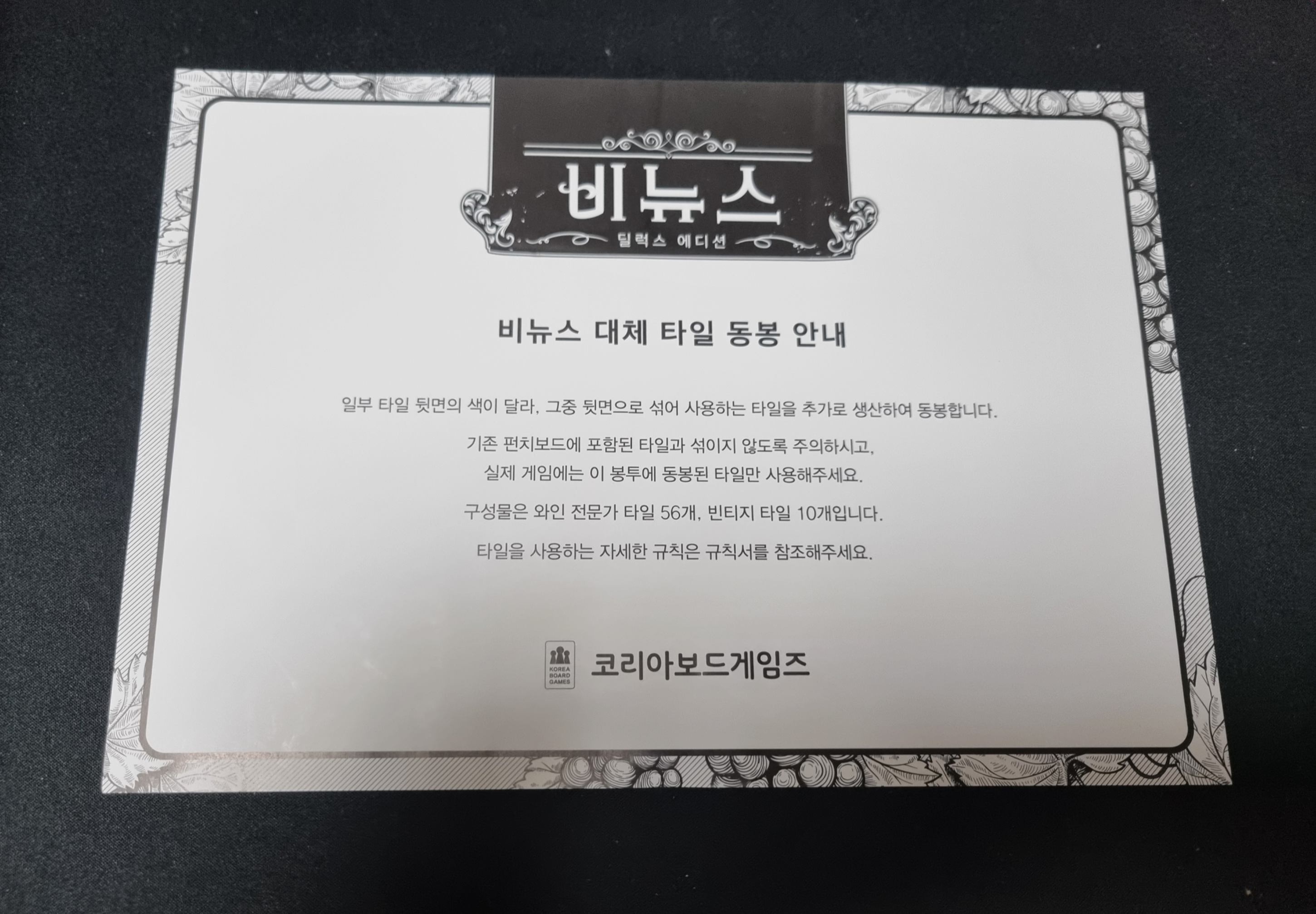 코리아보드게임즈의 비뉴스 딜럭스 에디션 한글판의 경우 대체 타일이 별도로 첨부되어 있습니다.