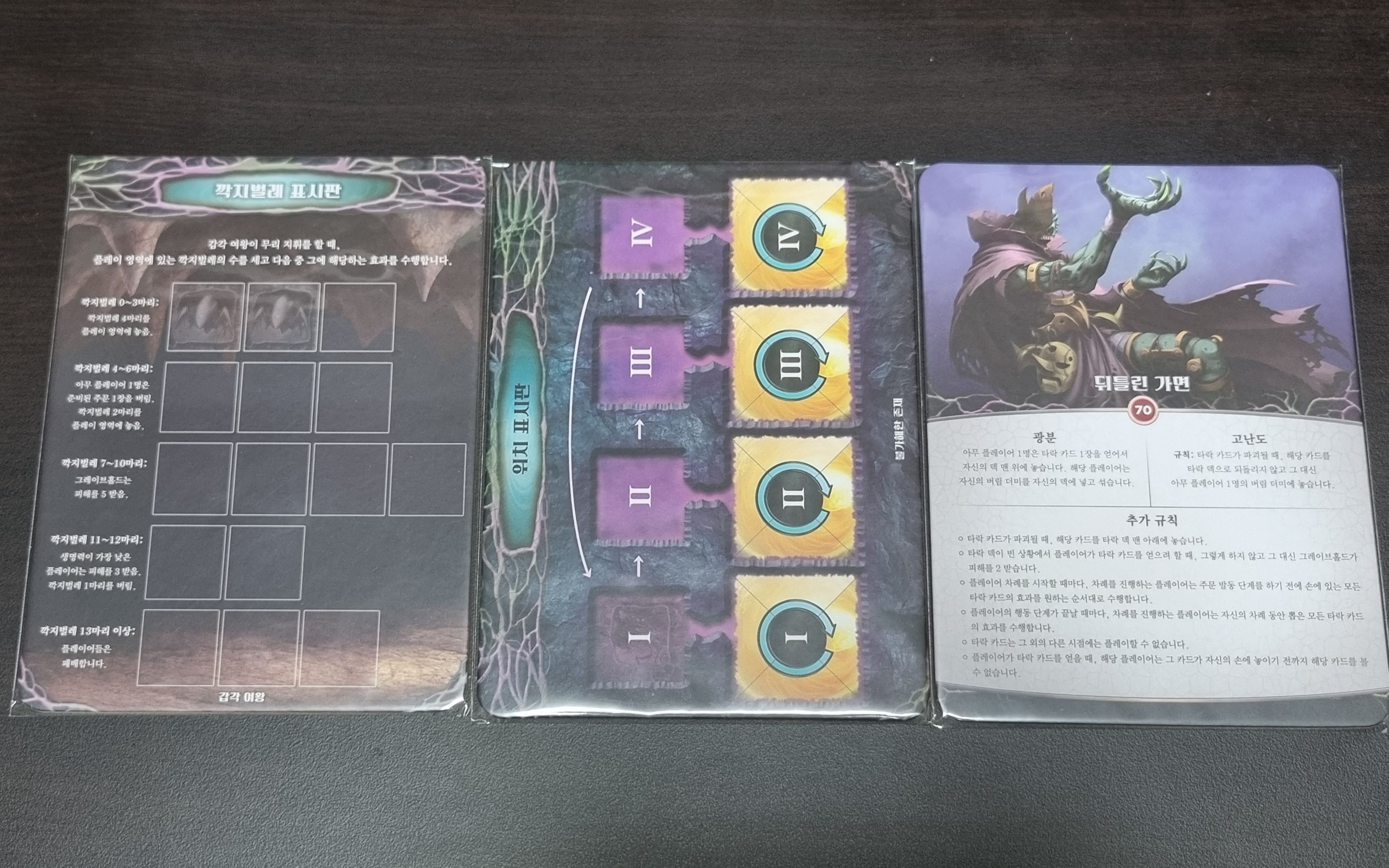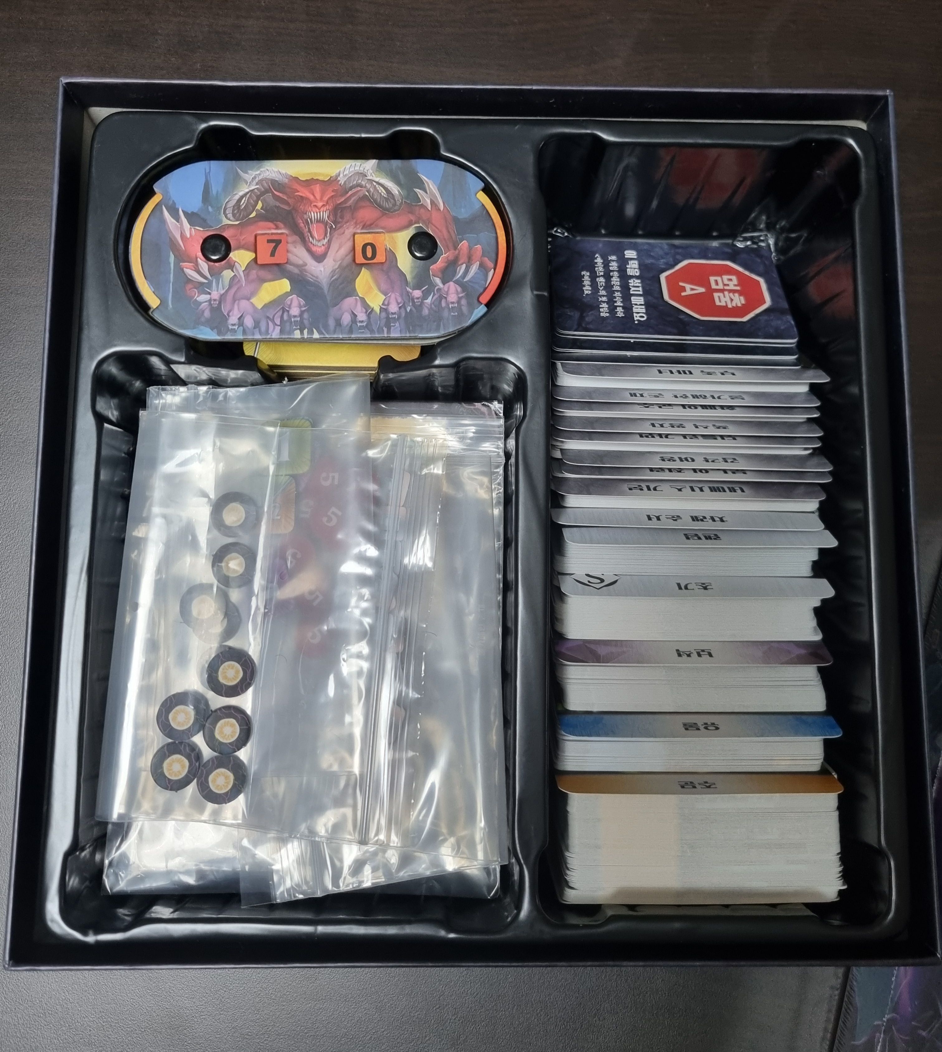 글로만 적어도 세팅이 얼마나 부담스러운지 느낄 수 있습니다. 실제로 플레이 하려면 카드 뭉치를 꺼내서 몇 장을 용도에 맞게 찾아서 골라내야 하고 혼자서 세팅하면 때려치고 싶은 마음이 정말 많이 들었습니다. 게임이 끝나고 정리할 때도 각 카드를 디바이더에 맞게 분류해서 넣어줘야 합니다. 게임을 처음 할 때는 신선하니 하나씩 별 생각없이 해나갔지, 두 판째부터는 게임을 할 때마다 이 짓을 해야 한다고 생각이 들어 손이 잘 안 갑니다. 에이언즈 엔드 랜더마이저 어플이 있습니다.