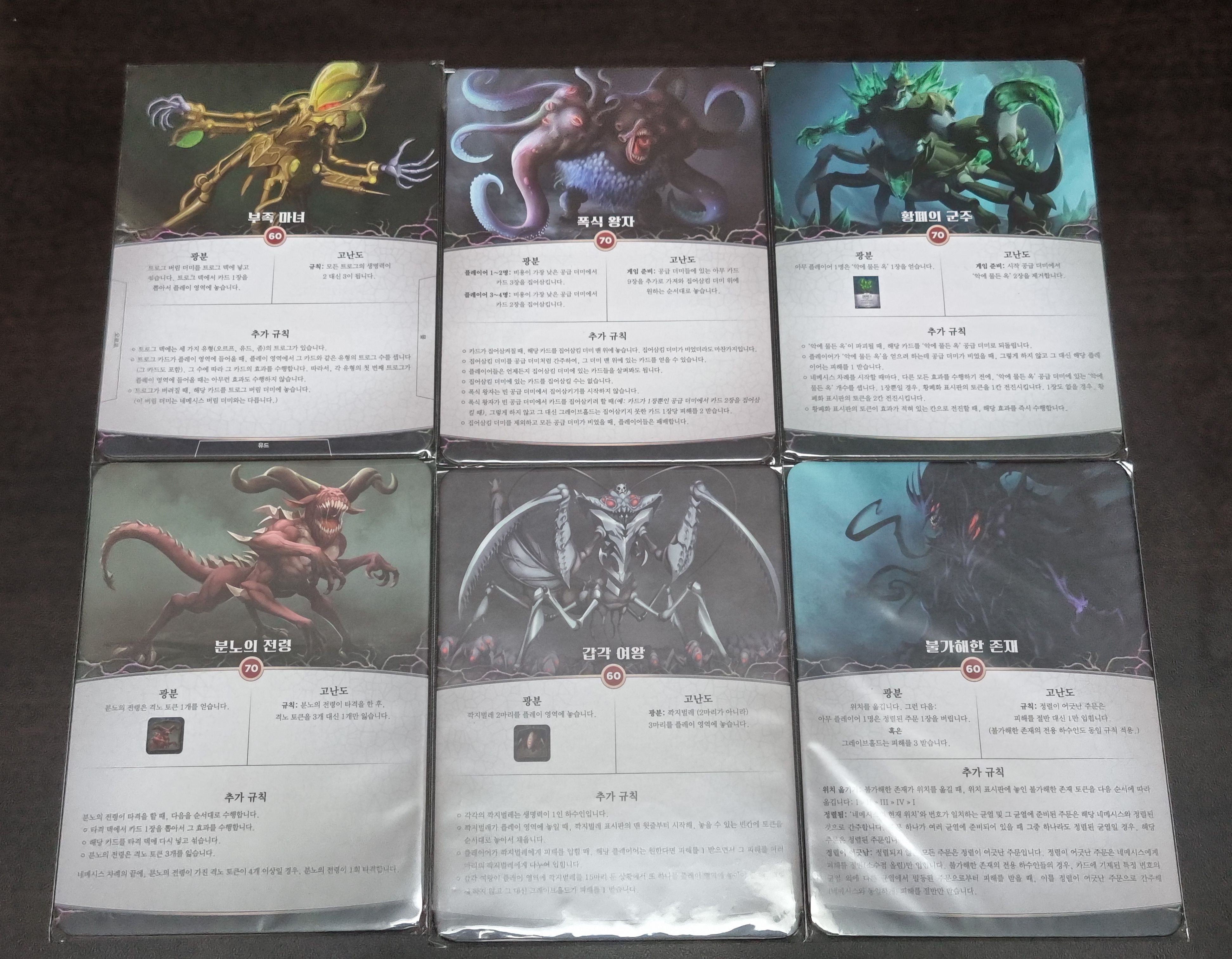 보스 레이드 장르에서 가장 유명한 게임은 아무래도 마블 챔피언스와 에이언즈 엔드인데 본판만 구입한다고 했을 때 에이언즈 엔드가 리플레이성이 훨씬 높습니다. 마블 챔피언스는 히어로 5명과 빌런 3명 뿐이지만, 에이언즈 엔드는 본판에 킥스타터 펀딩 당시 함께 출시된 <에이언즈 엔드 심연> 확장과 <에이언즈 엔드 이름 모를 것> 확장이 포함되어 있어 캐릭터 12명과 네메시스 7개가 들어 있습니다. 마블 챔피언스는 마켓이 없어서 시작 덱을 구성한 채로 끝까지 가지만, 에이언즈 엔드는 마켓을 어떻게 구성하느냐에 따라 캐릭터 능력과 시너지가 다르기 때문에 리플레이성이 더 높은 편입니다. 마딱처럼 에엔도 확장과 섞어 쓸 수 있고, 카드 자체의 볼륨량으로만 따지면 에엔이 훨씬 많습니다.