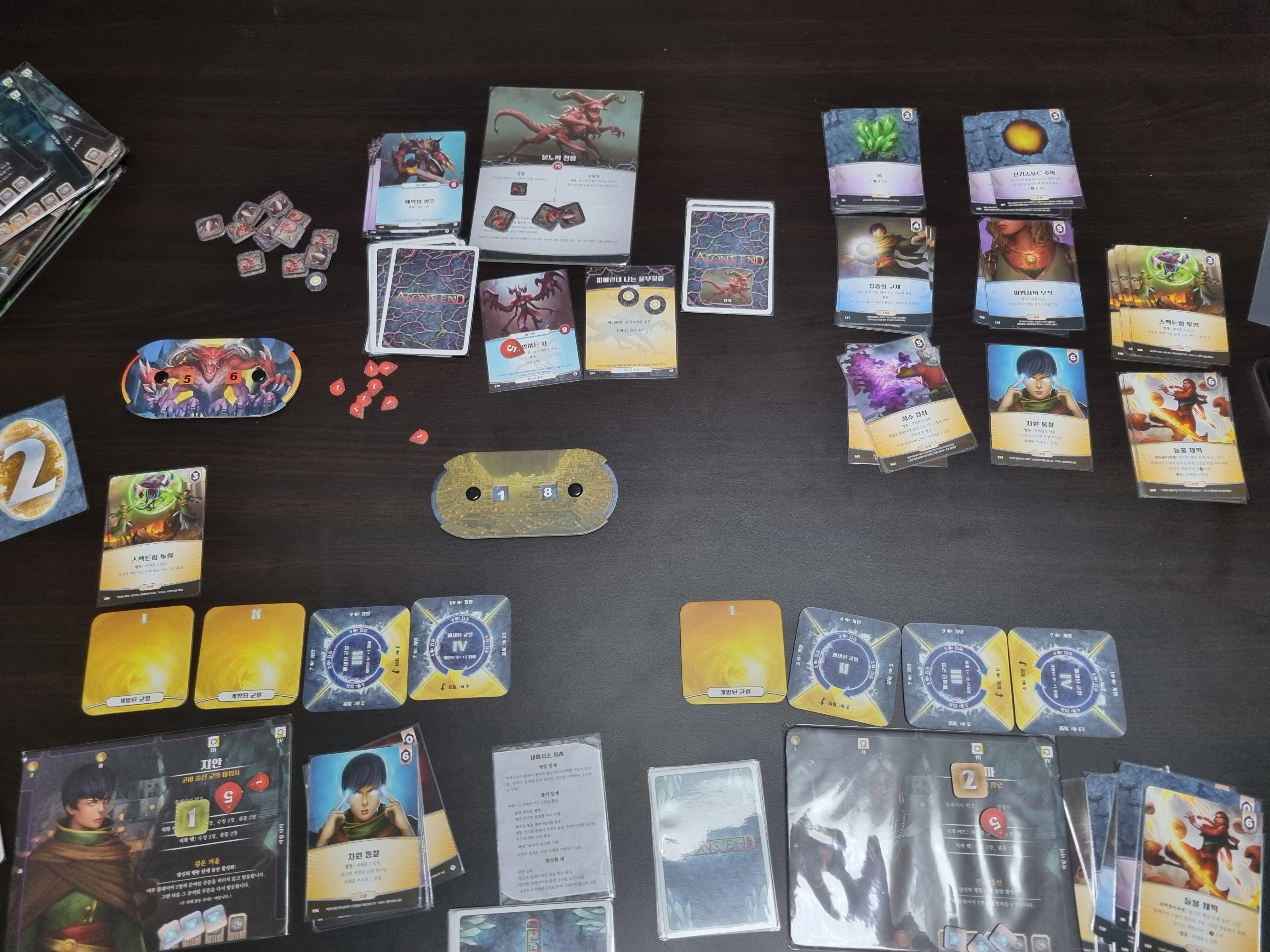 네메시스의 난이도가 올라갈수록 공격이 강력해서 차례 서순 운이 크게 작용합니다. 어떤 플레이어가 먼저 차례를 가지는지, 네메시스가 어떤 타이밍에 차례를 가지는지에 따라 적의 공격을 효과적으로 막기도 하고 게임이 아예 끝나버리기도 합니다. 이론적으로 네메시스가 최대 4번까지 연속으로 차례를 가질 수 있는데, 후반부에 네메시스가 연달아 차례를 가져 게임에서 패배하면 결정적인 순간에 운이 정말 크게 작용한다고 느낍니다. 덱빌딩은 전략적 요소인데, 차례 순서는 운적 요소입니다. 전반부, 중반부 공들여 덱빌딩을 열심히 해놨더니 마지막 승패가 허무하게 운으로 갈리면 "이건 좀 아니지 않냐. 한 두 차례만 무르자.", "깬 걸로 치자."라는 말이 절로 나옵니다. 게임 컨셉이 처음부터 운이 중요하면 모를까 전략적인 척 하다 뒤통수 치는 느낌이 썩 좋지 않았습니다. 제가 에엔에게 기대했던 건 운이 중요한 게임 같았는데 하면할수록 내 전략이 중요하다고 느껴지는 게임이었는데 반대였습니다.